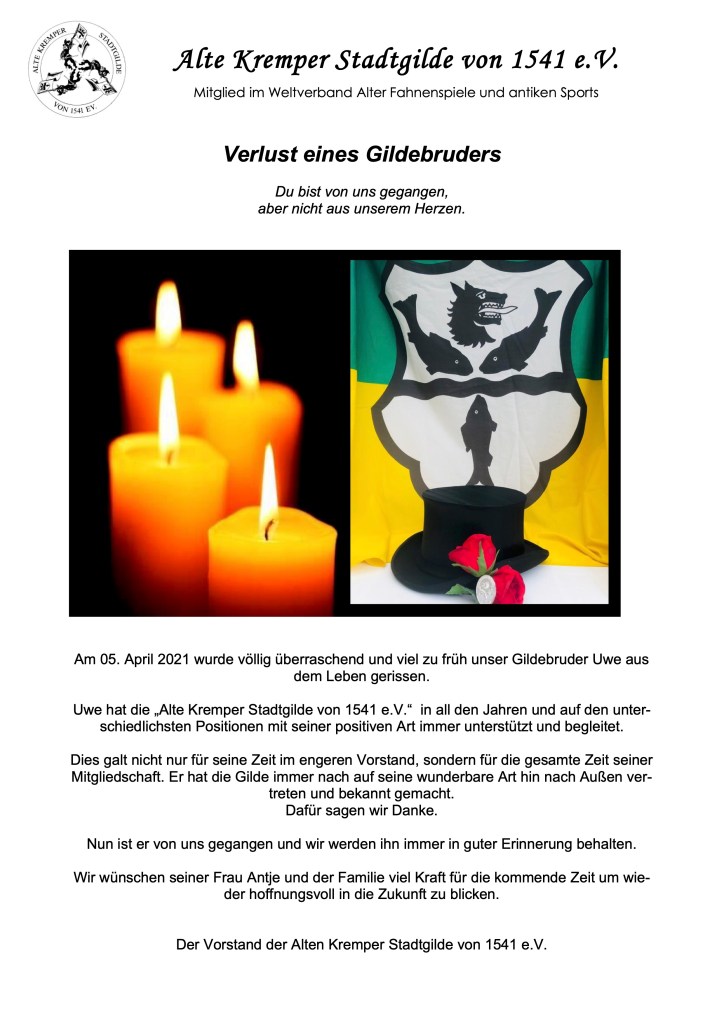 Wir trauern Veröffentlicht am 26. April 202127. April 2021 von gilde1541 Teilen mit: Klicke, um auf X zu teilen (Wird in neuem Fenster geöffnet) X Klick, um auf Facebook zu teilen (Wird in neuem Fenster geöffnet) Facebook Gefällt mir Wird geladen …