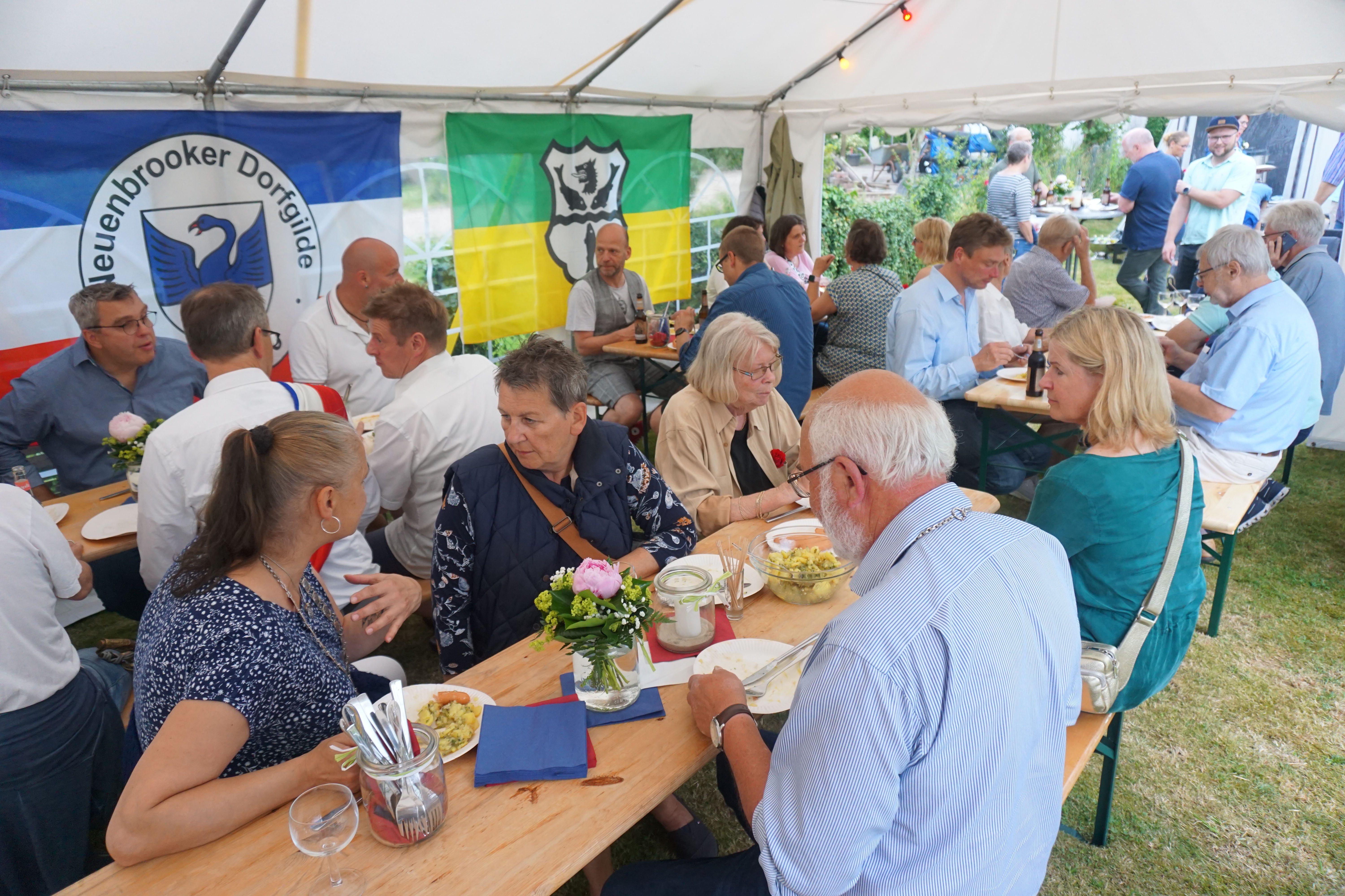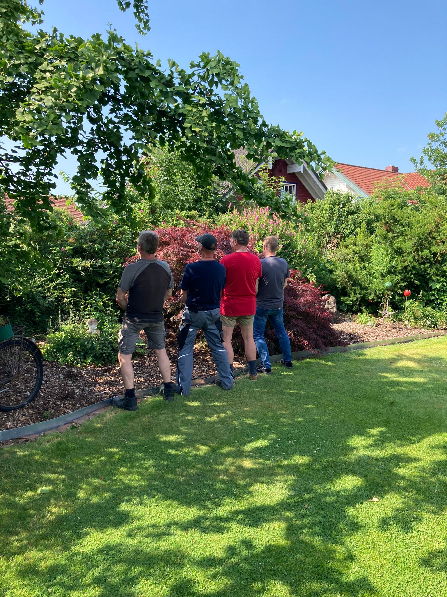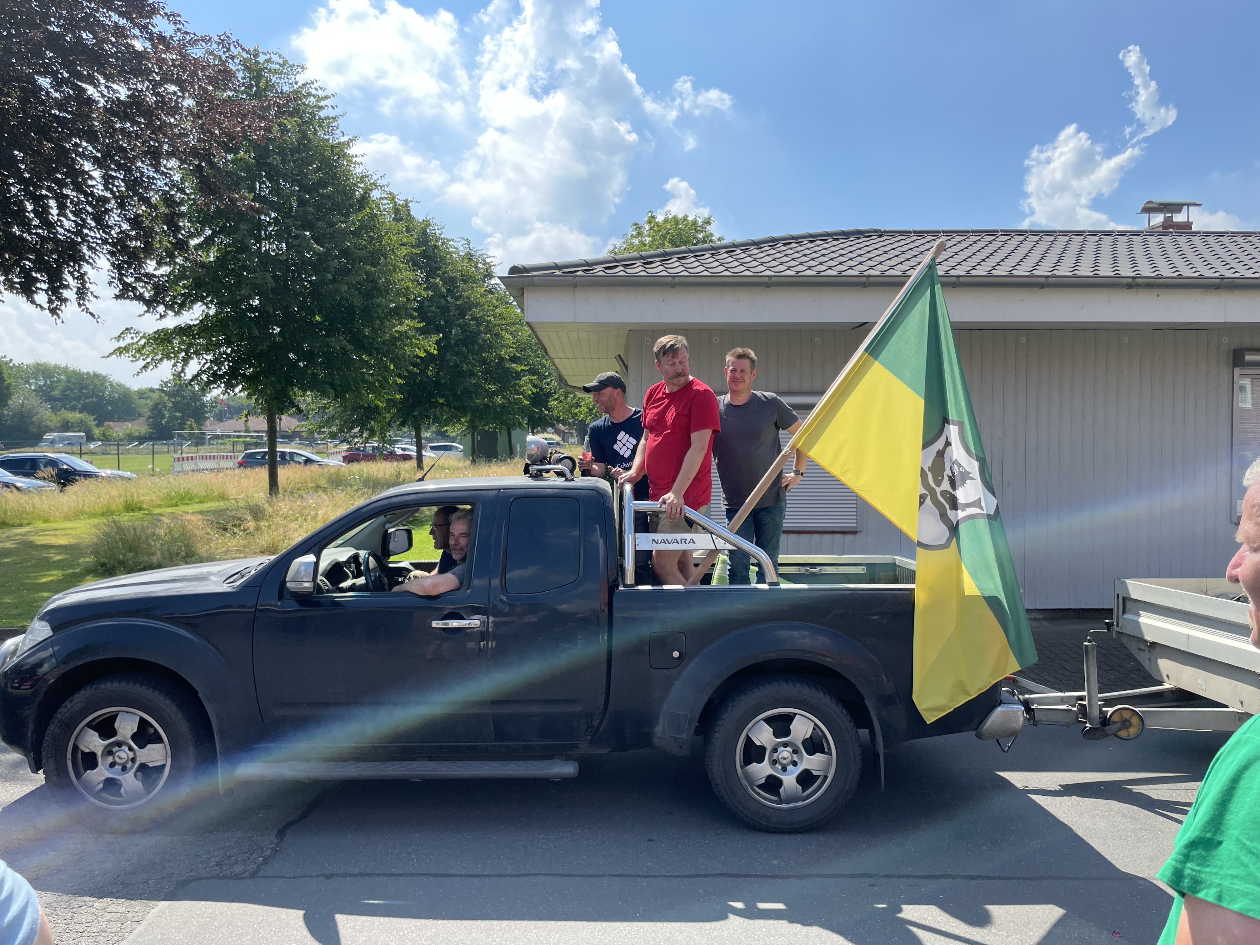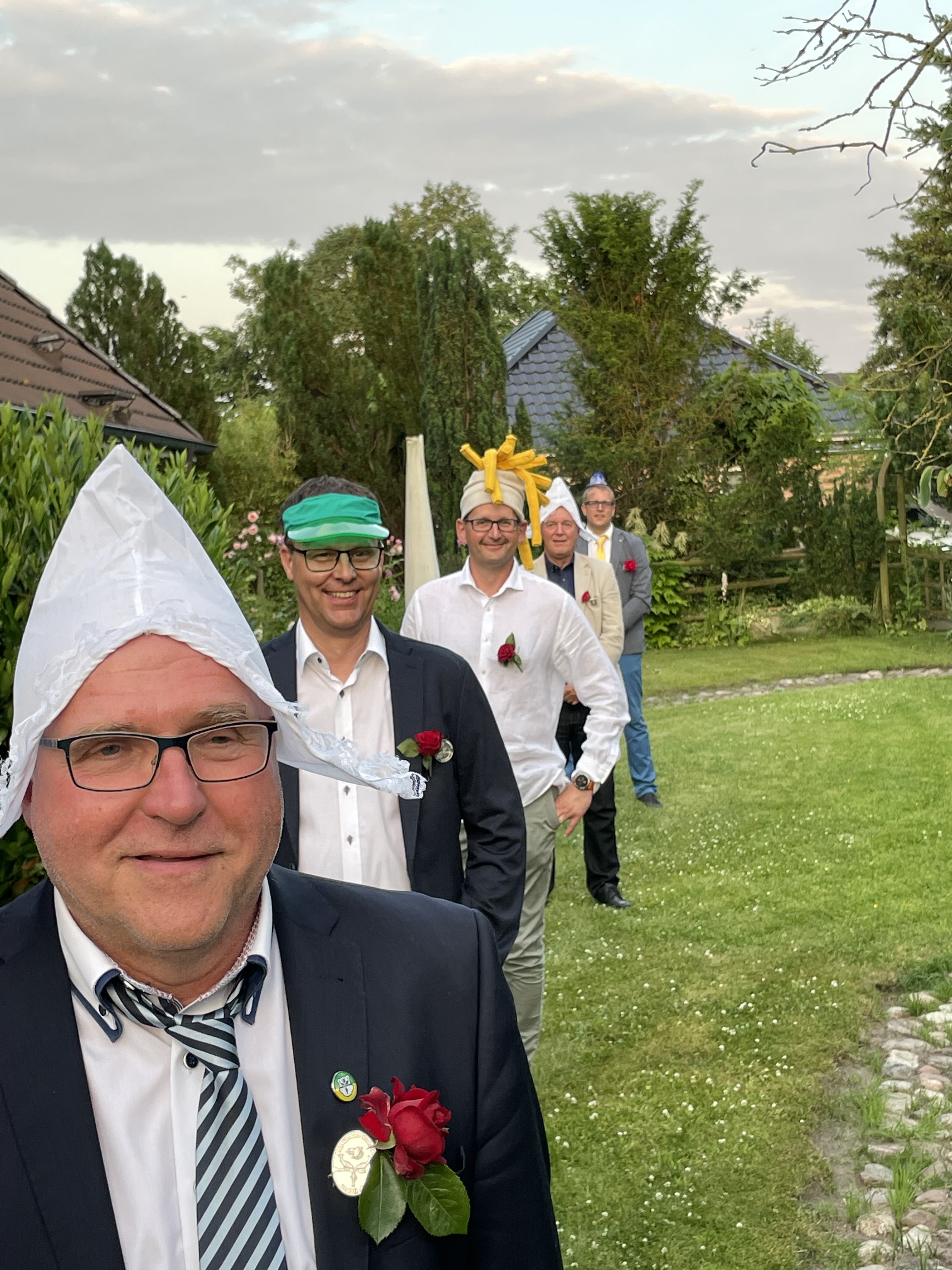 Eine Gildeveranstaltung / Dienst reiht sich an die nächste in diesen Tagen und dann sind auch noch besondere Einladungen wahrzunehmen…Am Freitag abend lud das Neuenbrooker Botschafterältermannaltschafferpaar Ahrens in ihre mobilde Vertretung zu einem kleinen Empfang mit Häppchen (abgespreizter Finger am Bitternglas selbstredend…Etikette und so!) Auch die Bürgermeister:inn beider Orte sowie die jeweiligen Regenten gaben sich die Ehre. Samstag morgen ginge es für die Schaffer früh raus um die Birken zu schlagen und auszuliefern, leider das Maßband vergessen, so waren eigentlich alle Gewächse bauamtlich zu hoch und mussten daher meist waagerecht an den zu beliefernden Gildehaushalten montiert werden… bei Bürgermeisters machte der Garten einen etwas schlappen Eindruck, woraufhin die Schafferriege selbstlos nachdüngte. Danke an den AOiR Piening, der den Schafffer-Streitwagen lenkte. Der restliche Gildevorstand war unterdessen mit Aufbau der großen Einkehr sowie des Schiesstandes beschäftigt. Abends fanden die drei traditionellen Säbelübergaben in den Haushalten des Hauptmanns und der Altoffiziere statt was sehr schön vom Gildeschreiber zeremoniert wurde, danach wurden noch flott die Schaffertierchen 2.0 auf ihre Einsatztauglichkeit untersucht und abgefüttert, bevor dann noch lange zusammen gefeiert wurde. Der Pegel sollte also nie zu tief sinken. Heute morgen waren dann Vorbereitungen zum Kranzbinden, welches just in dem Moment dieses Niederschriebes von Frau Hauptmann anmoderiert wird. Ferner gab es noch den stimmungsvollen und feierlichen Gildegottesdienst und das Säbelexerzieren beim Hauptmann um die eingerosteten Truppenteile der Schützen nach drei Jahren der Enthaltsamkeit zu reaktivieren um auf dem Marktplatz und allen Einkehren das Publikum mit astreinem Drill zu beeindrucken. Weiter Bilder folgen asap nach Verfügbarkeit. Dank an Martin und Thomas.