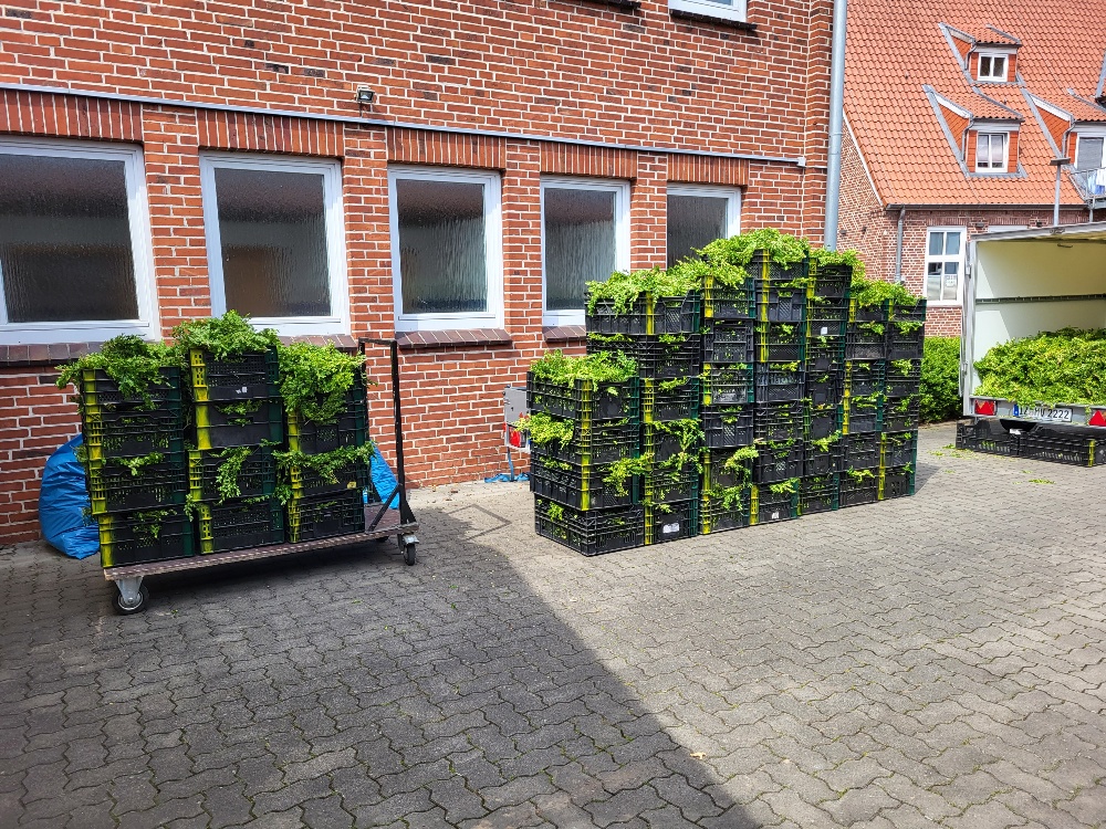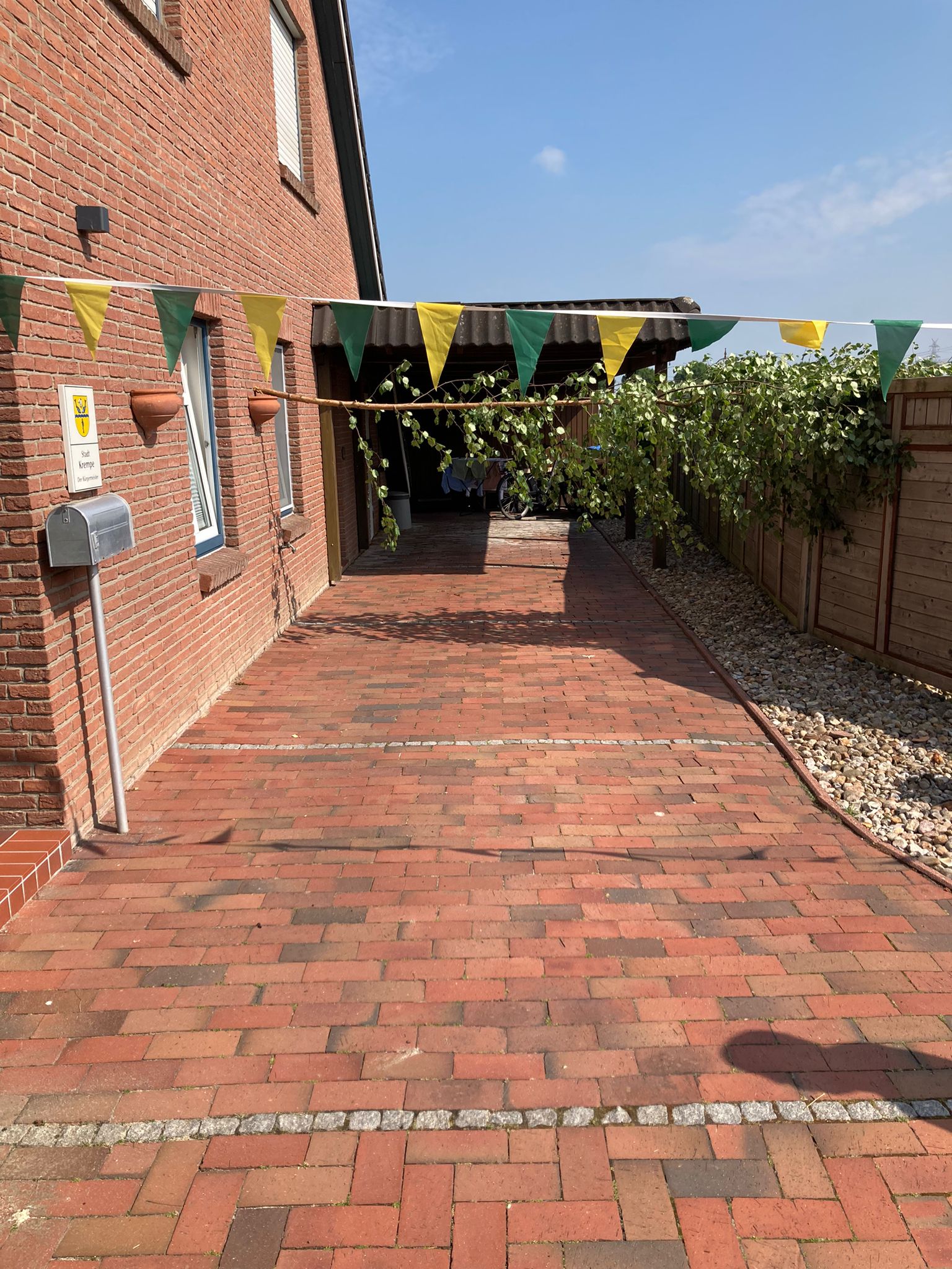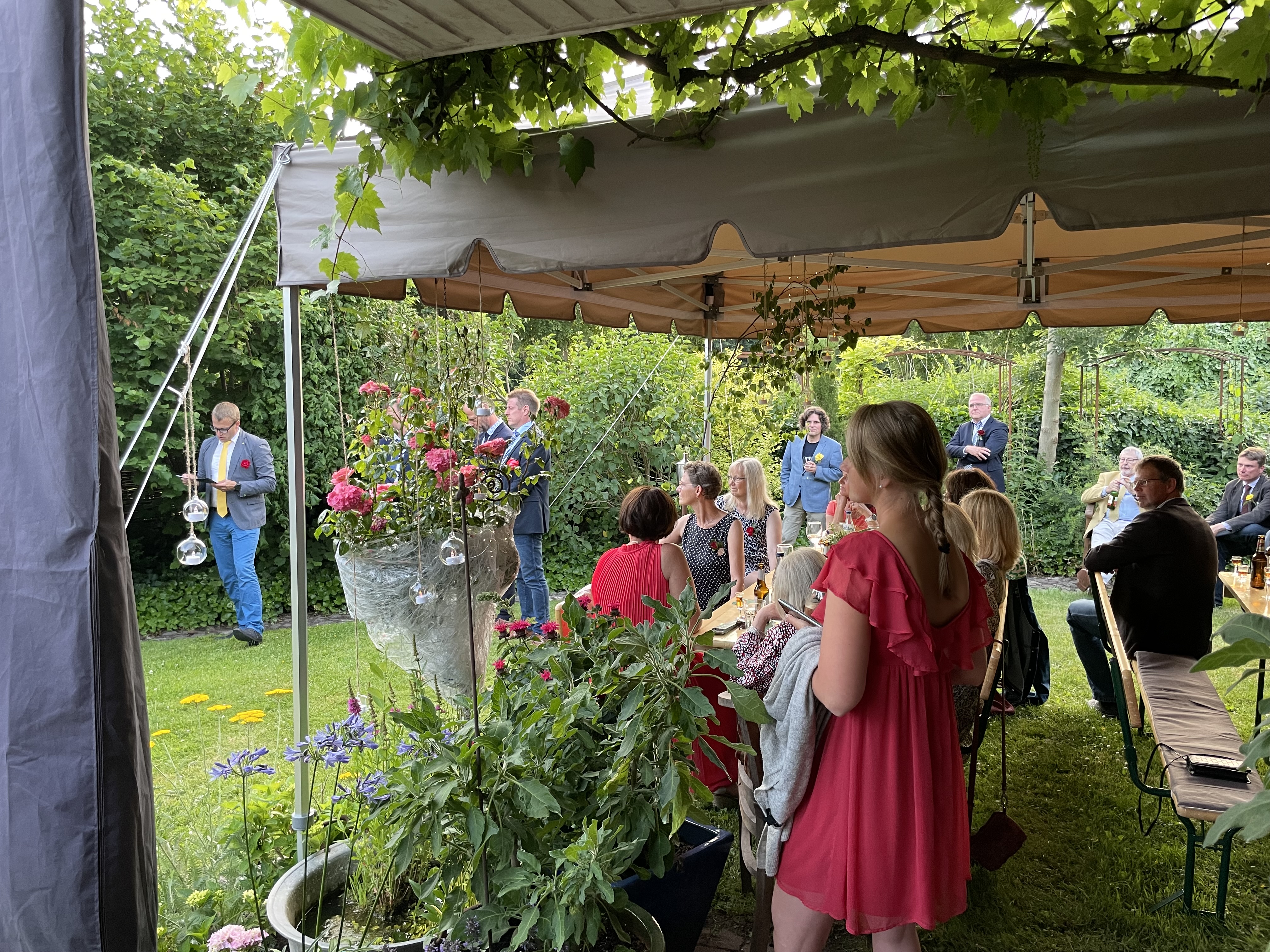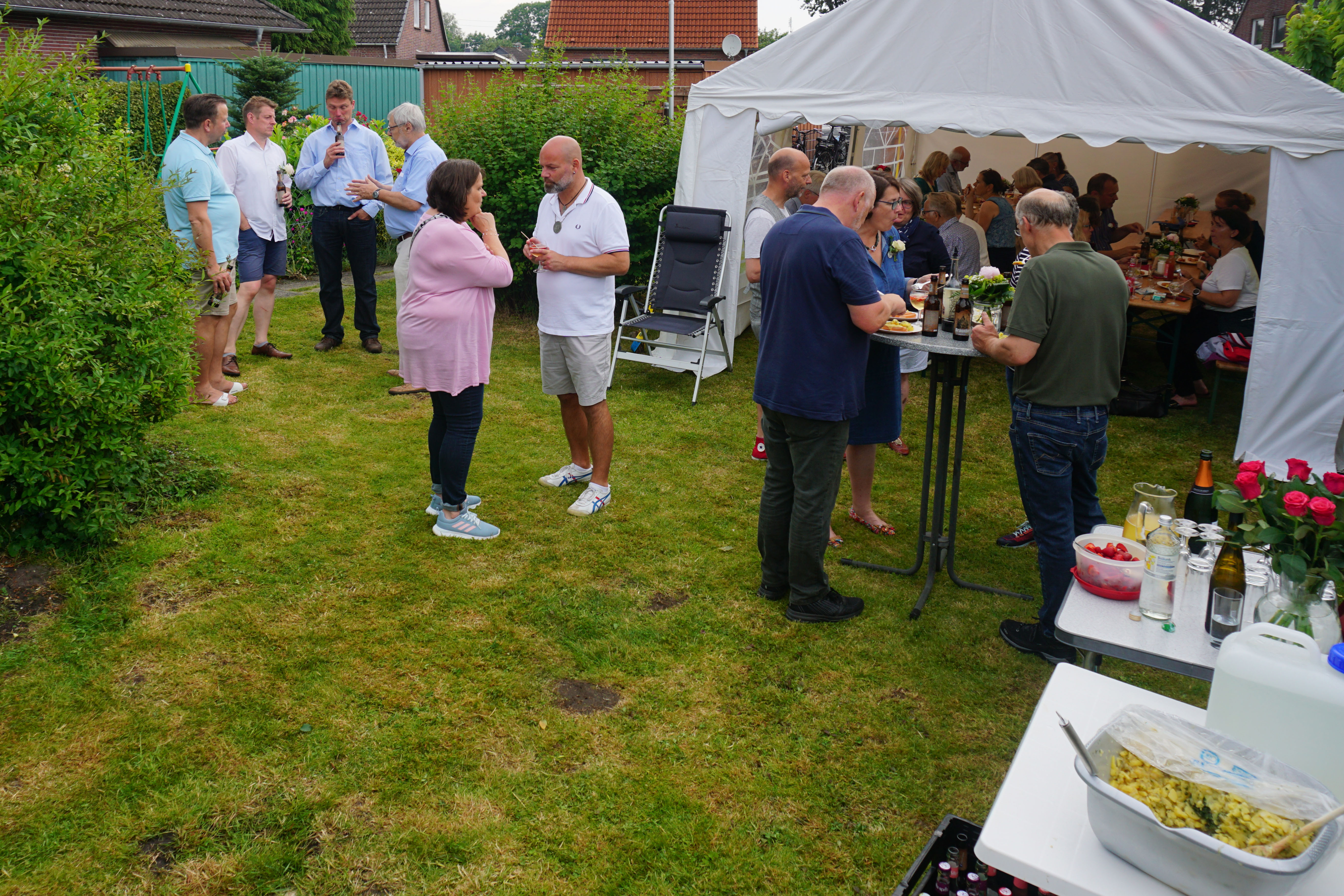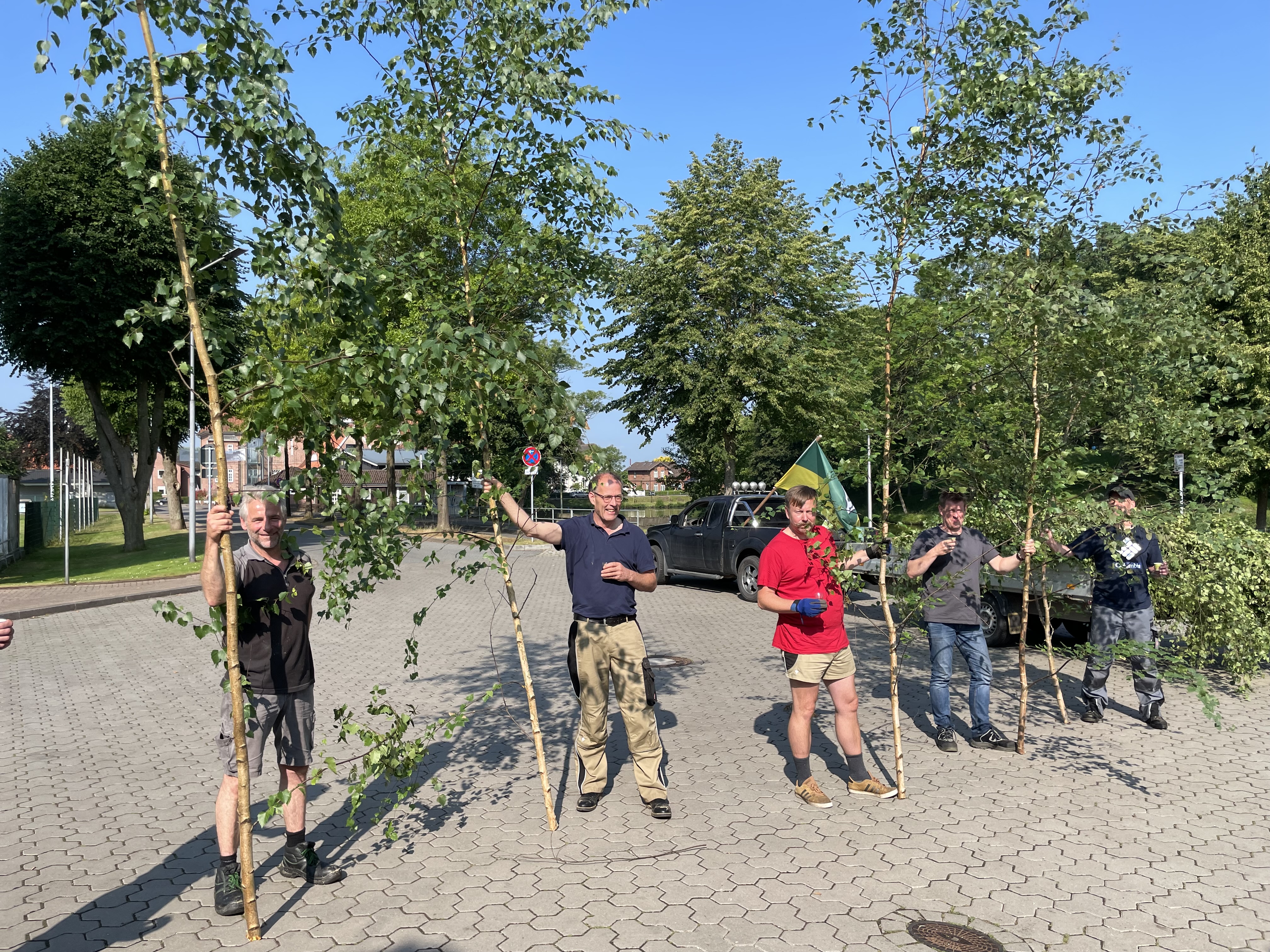 Eine Gildeveranstaltung / Dienst reiht sich an die nächste in diesen Tagen und dann sind auch noch besondere Einladungen wahrzunehmen…Am Freitag abend lud das Neuenbrooker Botschafterältermannaltschafferpaar Ahrens in ihre mobilde Vertretung zu einem kleinen Empfang mit Häppchen (abgespreizter Finger am Bitternglas selbstredend…Etikette und so!) Auch die Bürgermeister:inn beider Orte sowie die jeweiligen Regenten gaben sich die Ehre. Samstag morgen ginge es für die Schaffer früh raus um die Birken zu schlagen und auszuliefern, leider das Maßband vergessen, so waren eigentlich alle Gewächse bauamtlich zu hoch und mussten daher meist waagerecht an den zu beliefernden Gildehaushalten montiert werden… bei Bürgermeisters machte der Garten einen etwas schlappen Eindruck, woraufhin die Schafferriege selbstlos nachdüngte. Danke an den AOiR Piening, der den Schafffer-Streitwagen lenkte. Der restliche Gildevorstand war unterdessen mit Aufbau der großen Einkehr sowie des Schiesstandes beschäftigt. Abends fanden die drei traditionellen Säbelübergaben in den Haushalten des Hauptmanns und der Altoffiziere statt was sehr schön vom Gildeschreiber zeremoniert wurde, danach wurden noch flott die Schaffertierchen 2.0 auf ihre Einsatztauglichkeit untersucht und abgefüttert, bevor dann noch lange zusammen gefeiert wurde. Der Pegel sollte also nie zu tief sinken. Heute morgen waren dann Vorbereitungen zum Kranzbinden, welches just in dem Moment dieses Niederschriebes von Frau Hauptmann anmoderiert wird. Ferner gab es noch den stimmungsvollen und feierlichen Gildegottesdienst und das Säbelexerzieren beim Hauptmann um die eingerosteten Truppenteile der Schützen nach drei Jahren der Enthaltsamkeit zu reaktivieren um auf dem Marktplatz und allen Einkehren das Publikum mit astreinem Drill zu beeindrucken. Weiter Bilder folgen asap nach Verfügbarkeit. Dank an Martin und Thomas.