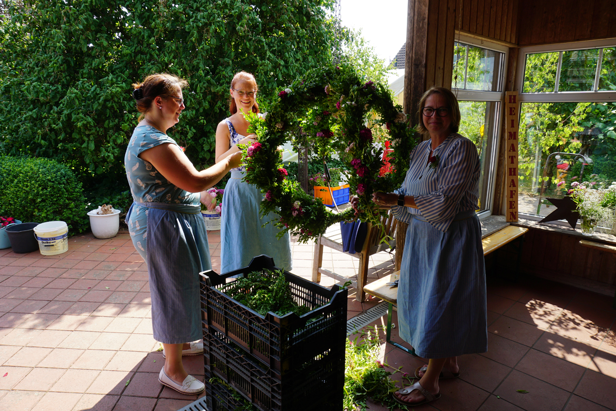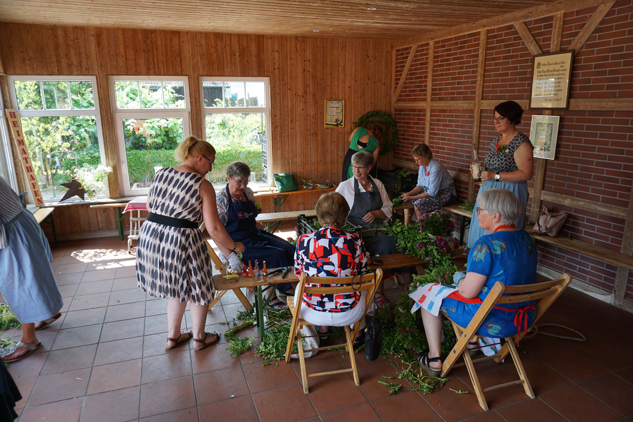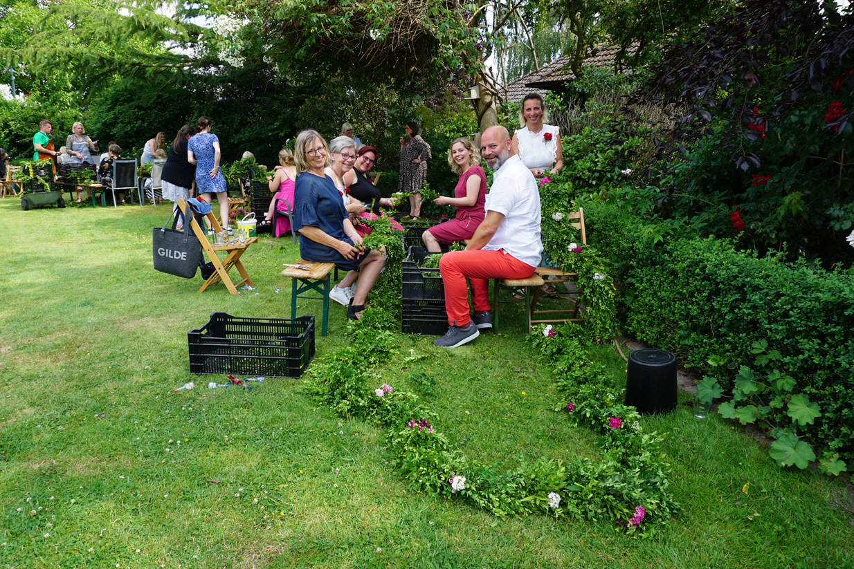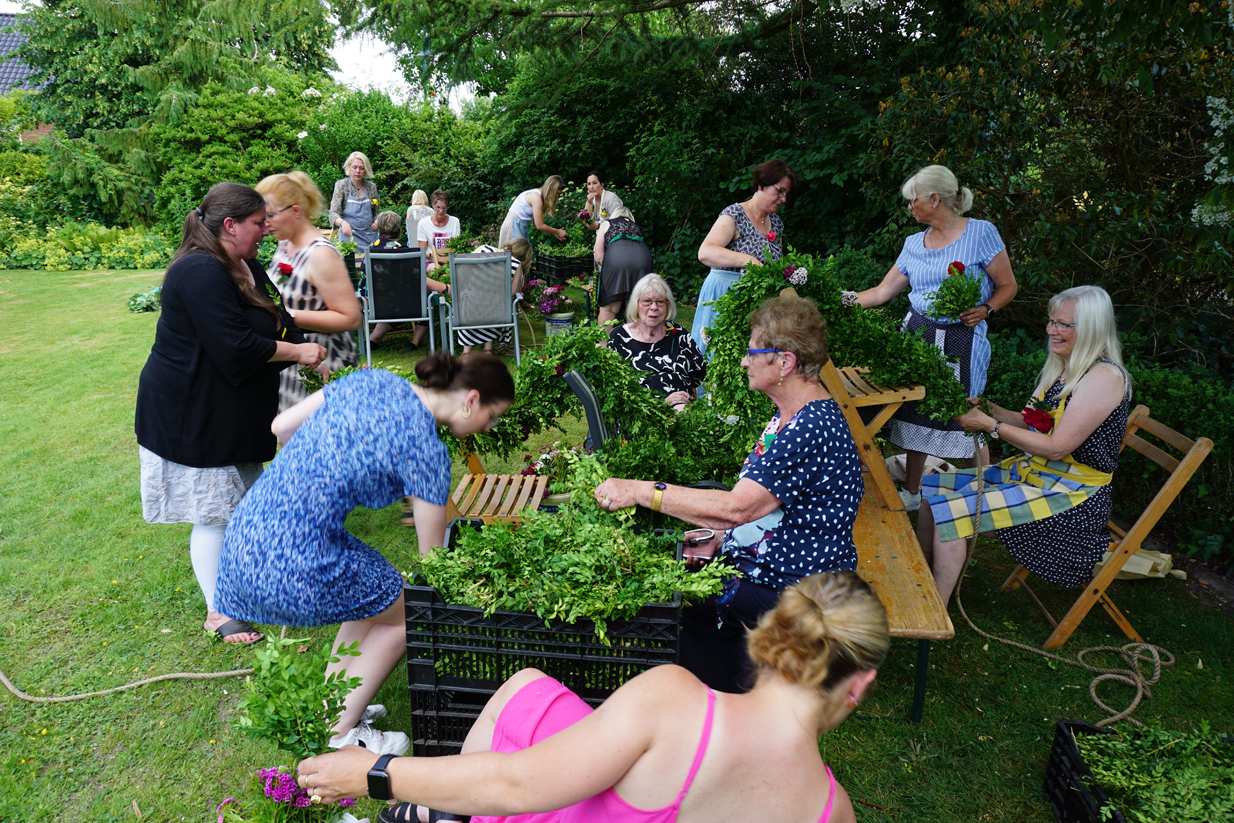 Am Sonntagnachmittag trafen sich im Hause des Kranzbinderschaffers Rentz die Damen des Vorstandes und zahlreiche Gäste, um die Kränze für den Gildeball in der Festhalle zu binden. Nachdem man sich mit Kaffee und Kuchen gestärkt hatte, mussten etliche Meter Tau mit Buchs, Bartnelken und Eichenlaub gebunden werden. Bei strahlendem Sonnenschein brachte diese Veranstaltung so manchen in Schwitzen. Nach getaner Arbeit erholten sich Alle bei einem fröhlichen Beisammensein.