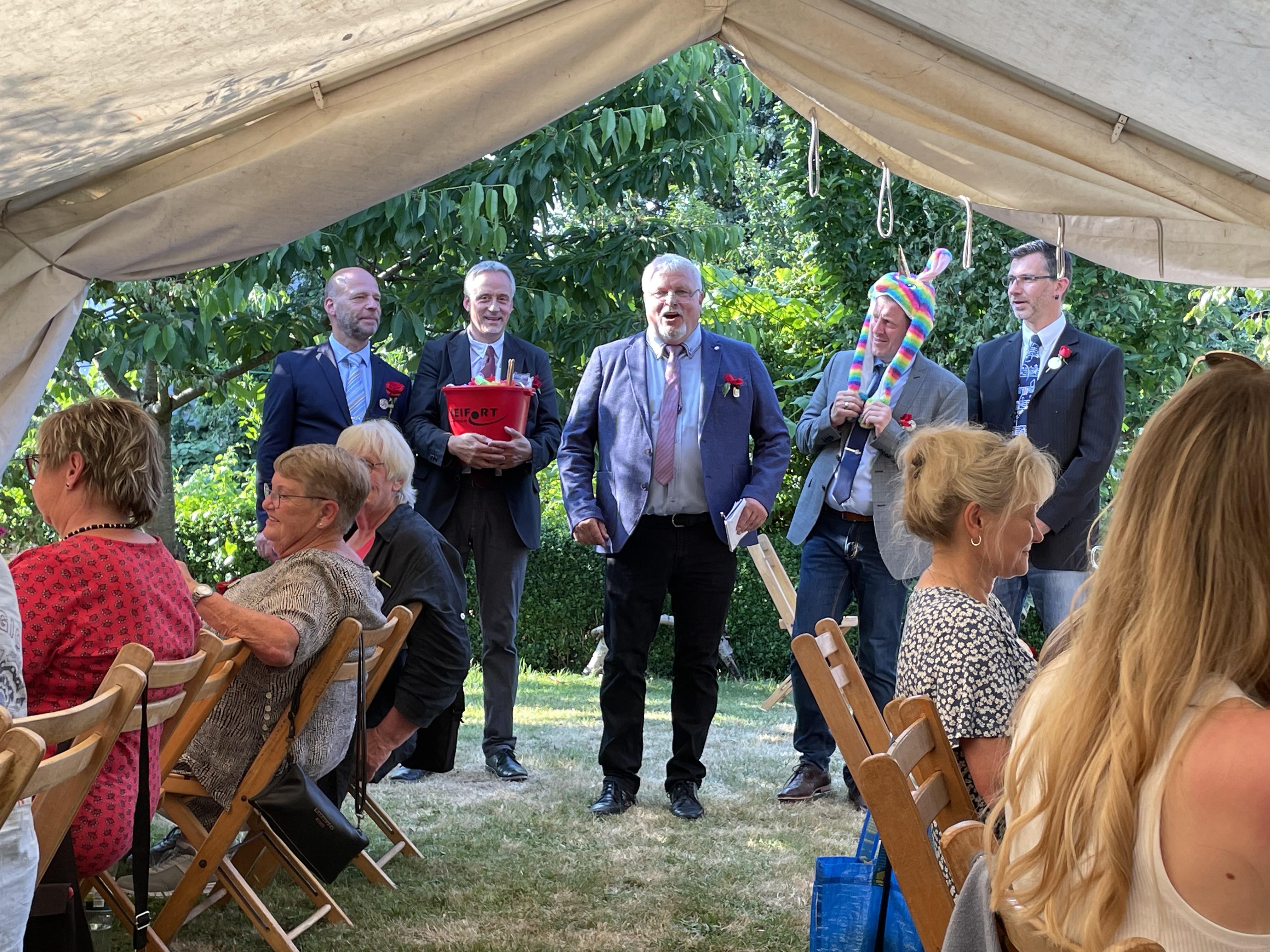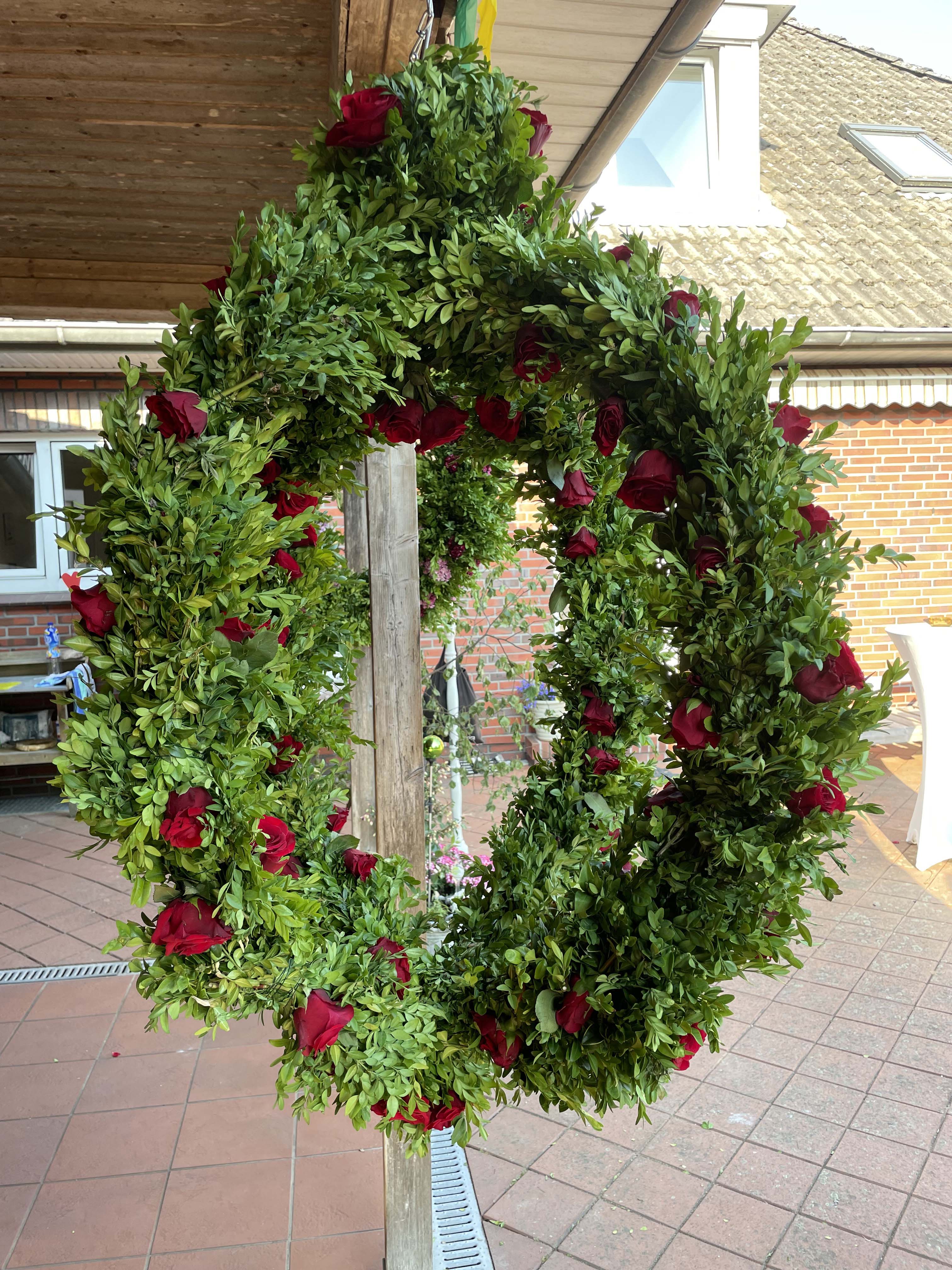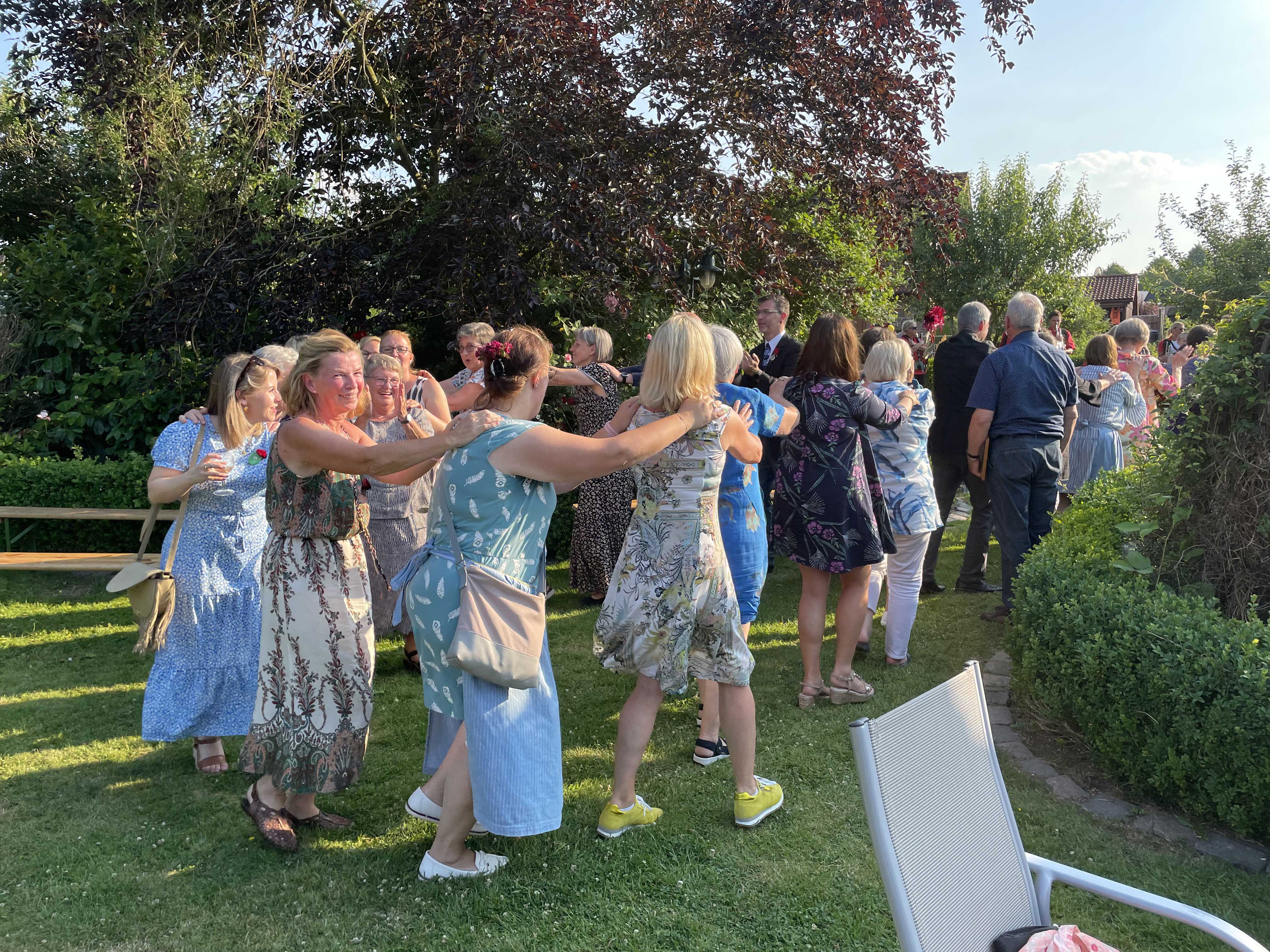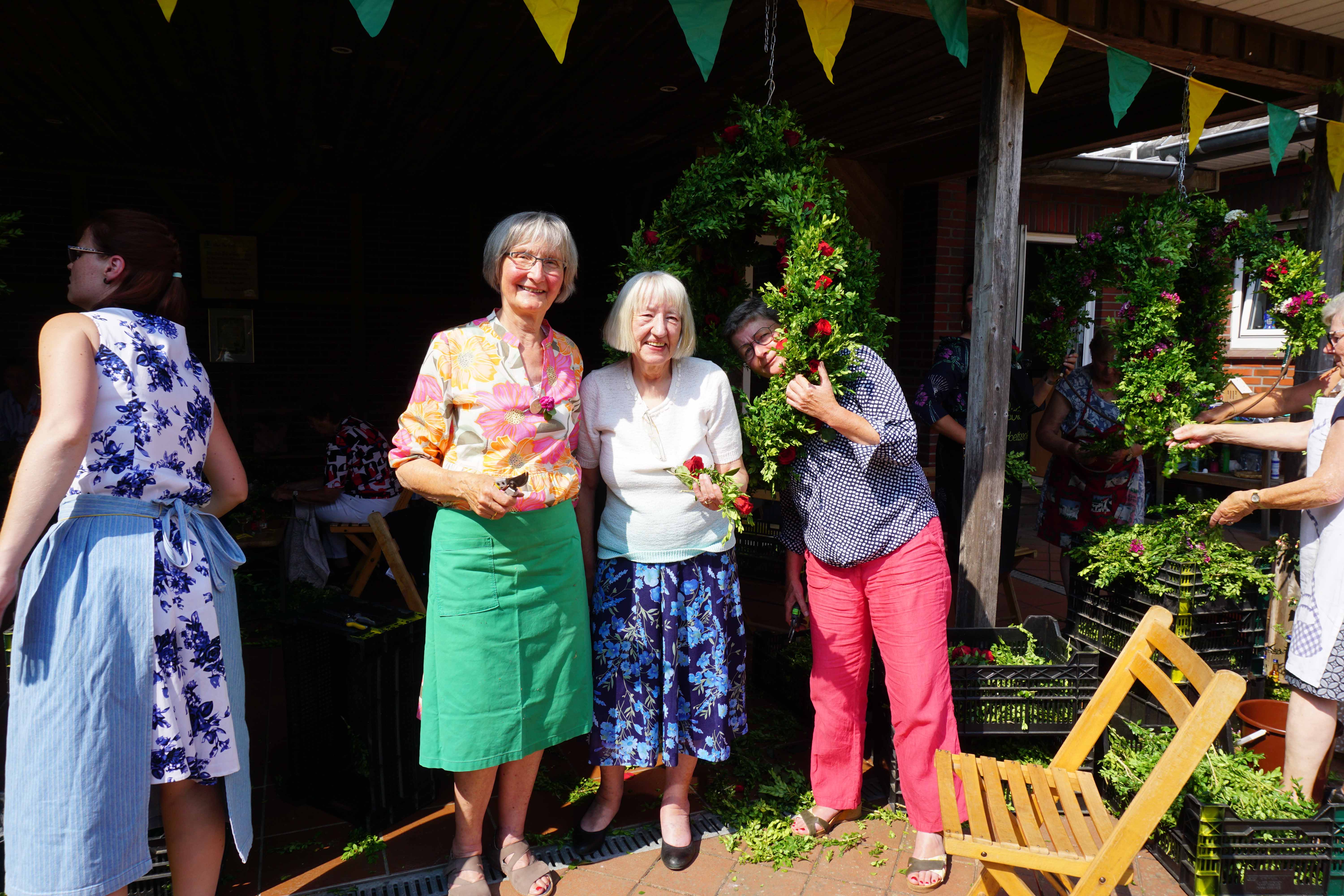 Am Sonntagnachmittag trafen sich im Hause des Kranzbinderschaffers Rentz die Damen des Vorstandes und zahlreiche Gäste, um die Kränze für den Gildeball in der Festhalle zu binden. Nachdem man sich mit Kaffee und Kuchen gestärkt hatte, mussten etliche Meter Tau mit Buchs, Bartnelken und Eichenlaub gebunden werden. Bei strahlendem Sonnenschein brachte diese Veranstaltung so manchen in Schwitzen. Nach getaner Arbeit erholten sich Alle bei einem fröhlichen Beisammensein.