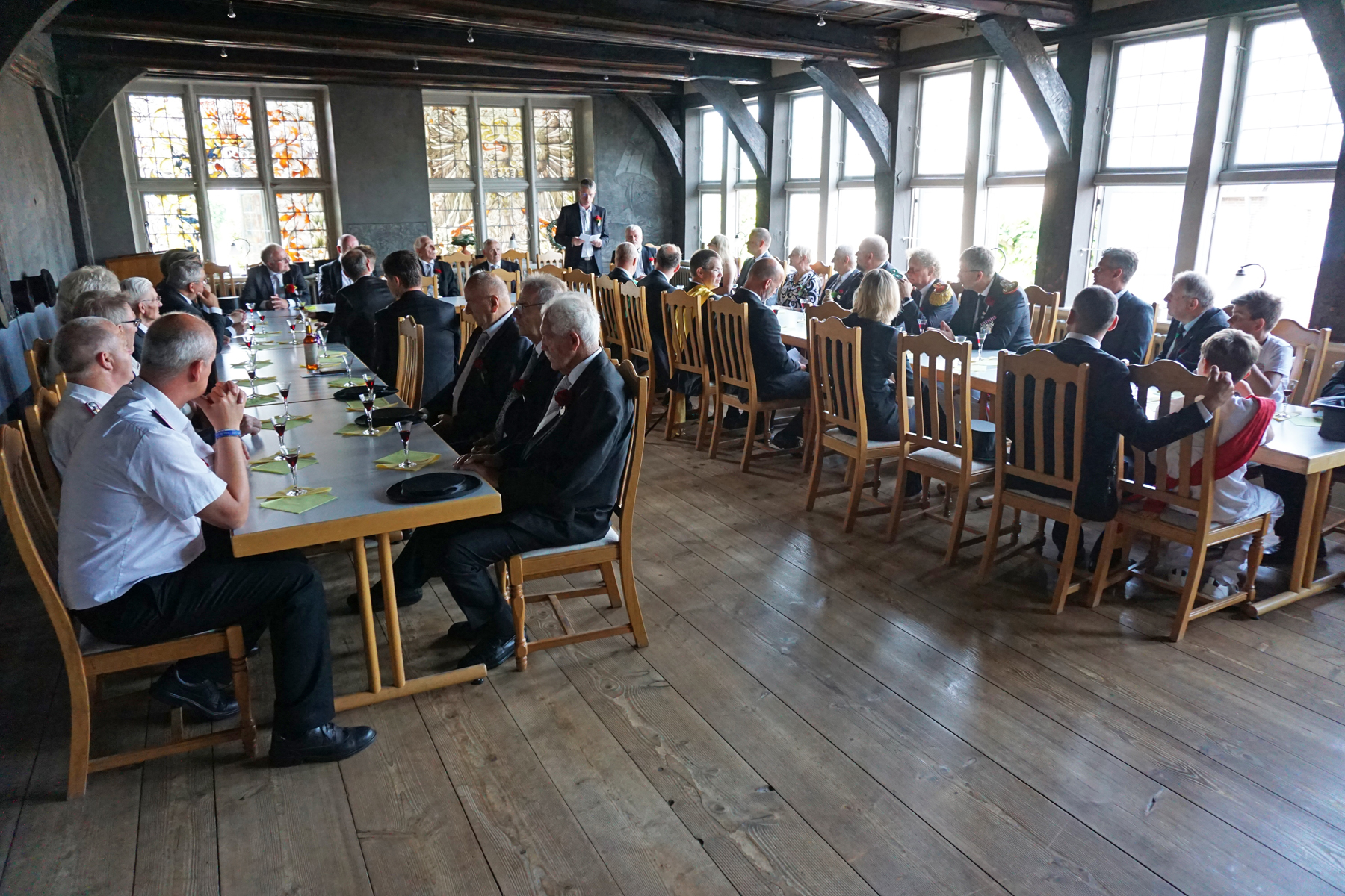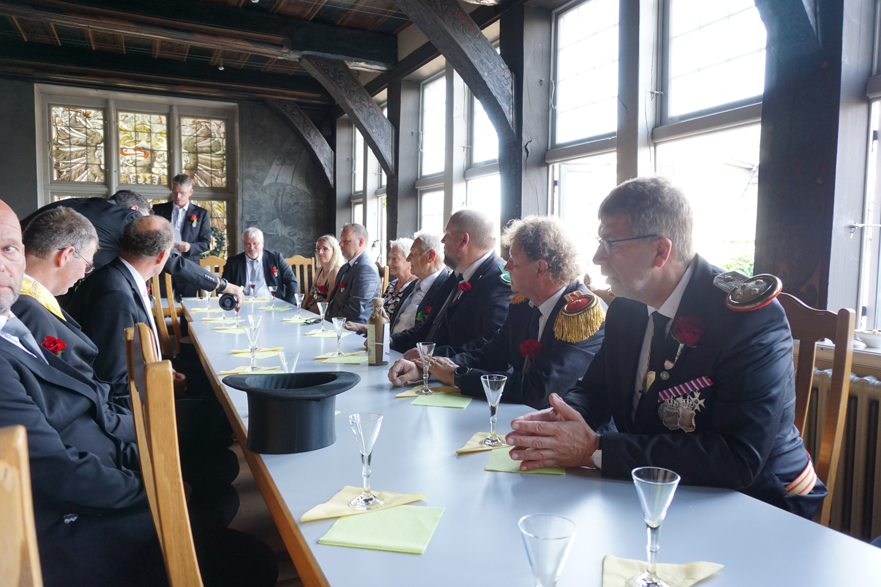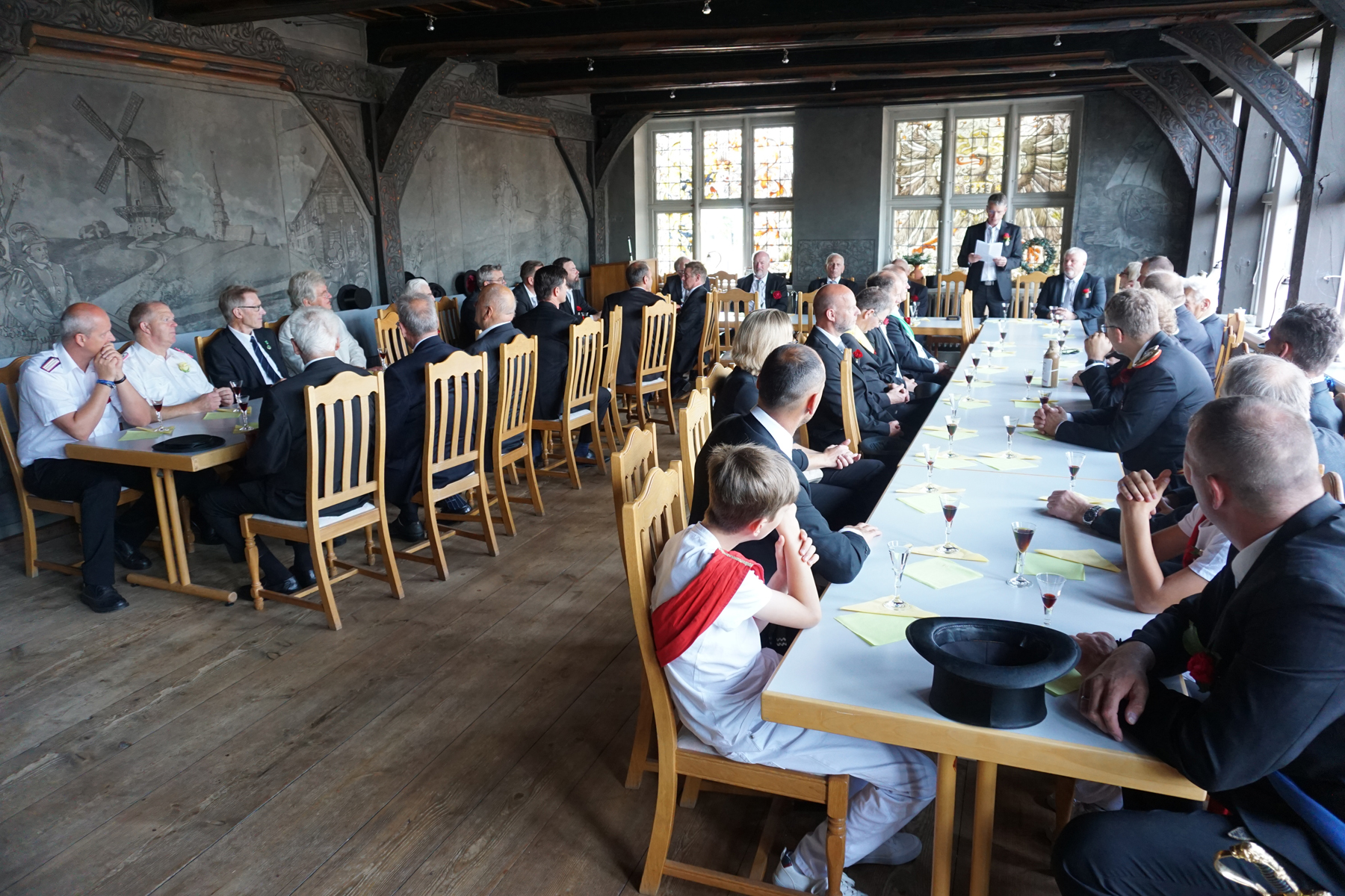 Am frühen Gilde-Montagmorgen gab es einen Empfang für den amtierenden König und seine Minister. Außer den Vorstandsmitgliedern waren Ehrenmitglieder und geladene Gäste anwesend. Bei dem Empfang wurde Portwein und Eiermahn gereicht, bevor sich die gesamte Gesellschaft auf den Marktplatz begab, um sich das Fahnenschwenken anzusehen.