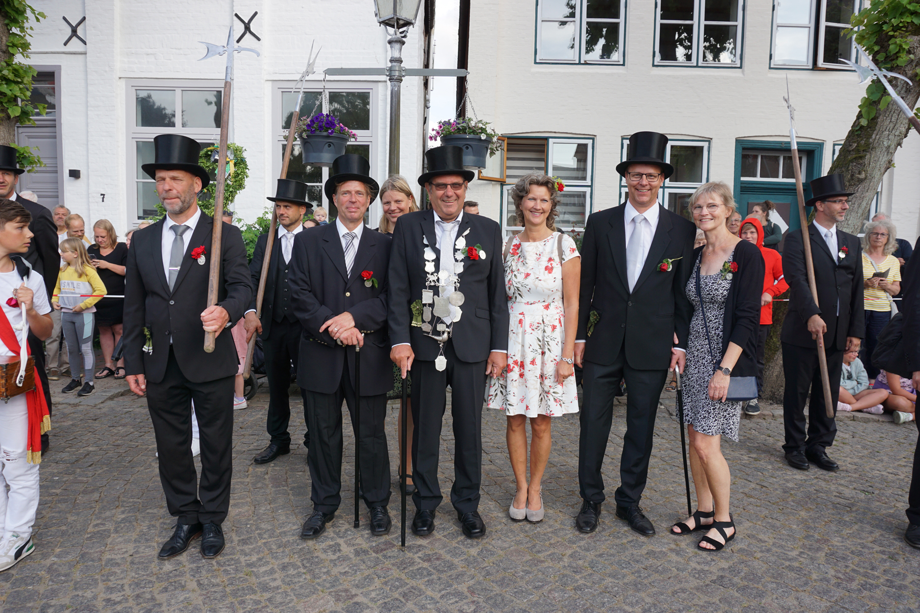 Schützenmeister Weise konnte sich über eine rege Beteilung der Schützen freuen. Die beste Zwölf schoss Uwe Panzlaff. Die Inthronisierung erfolgte nach dem abendlichen Fahnenschwenken im großen Saal des Rathauses. Ihm wurde der Name „Uwe der Stadtschamane“ verliehen. Zu seinen Ministern ernannte die Majestät Achim Gaitzsch (Kultusminister) und Helge Pahl (Finanzminister). Die Regierungserklärung seiner Majestät: Er möchte die Kremper Au aufstauen, einen Stausee errichten und durch ganz Krempe Kanäle ziehen, damit in jedem Haushalt ein Wasserrad für Energie sorgt. Und zur Gildezeit möchte er diese Kanäle mit Kremper Bitter fluten. So könnten Windräder und Photovoltaikanlagen wieder abgebaut werden.
