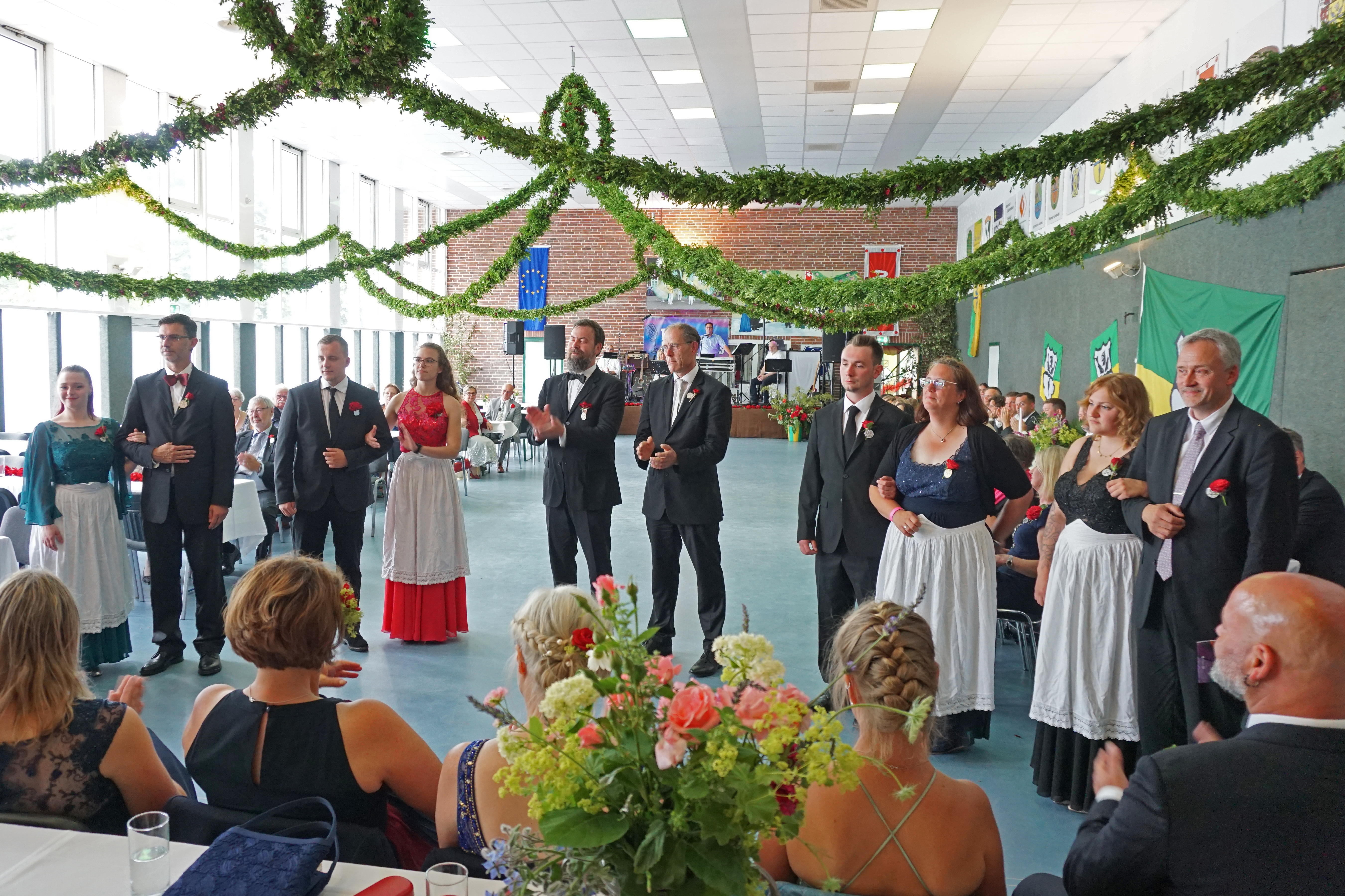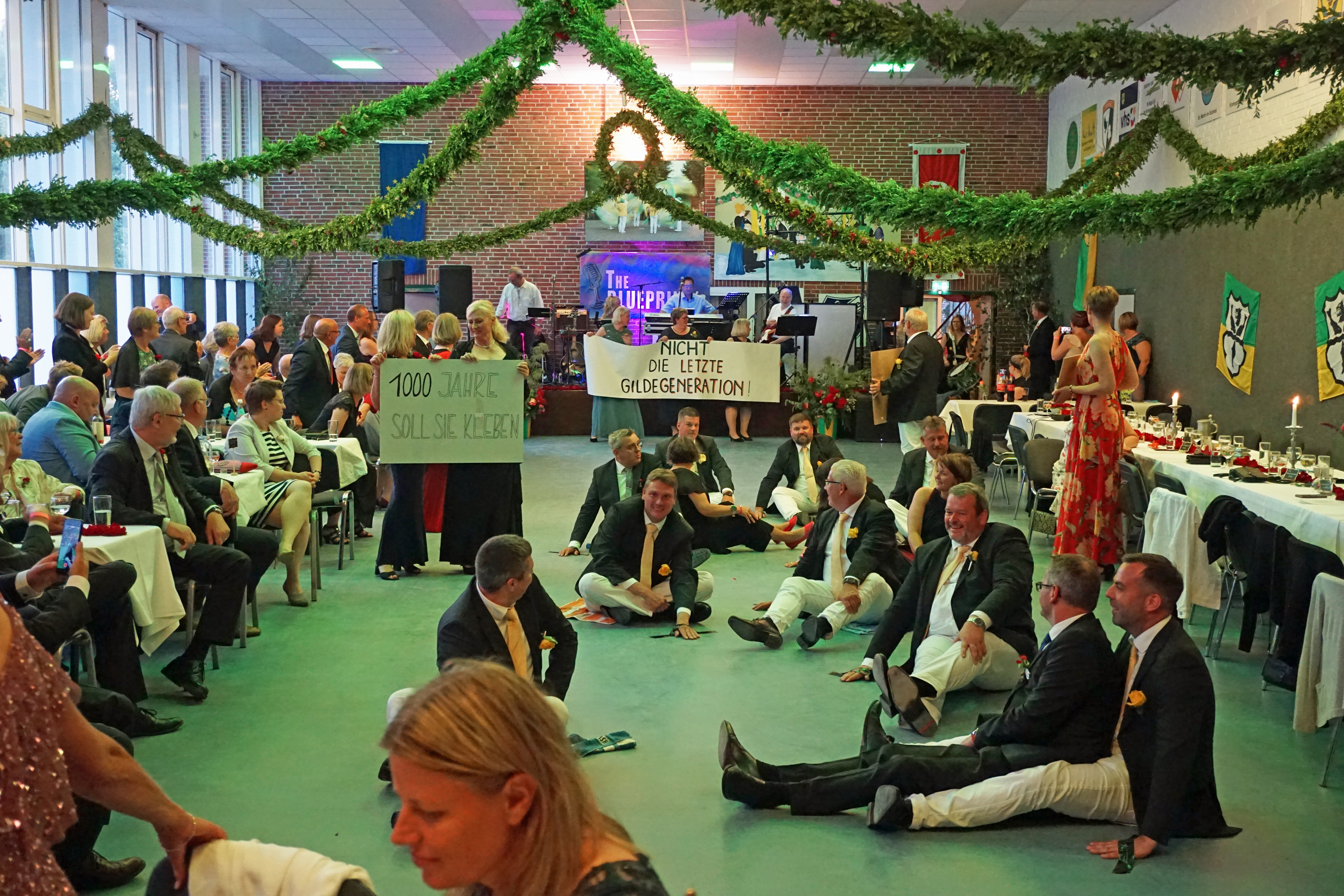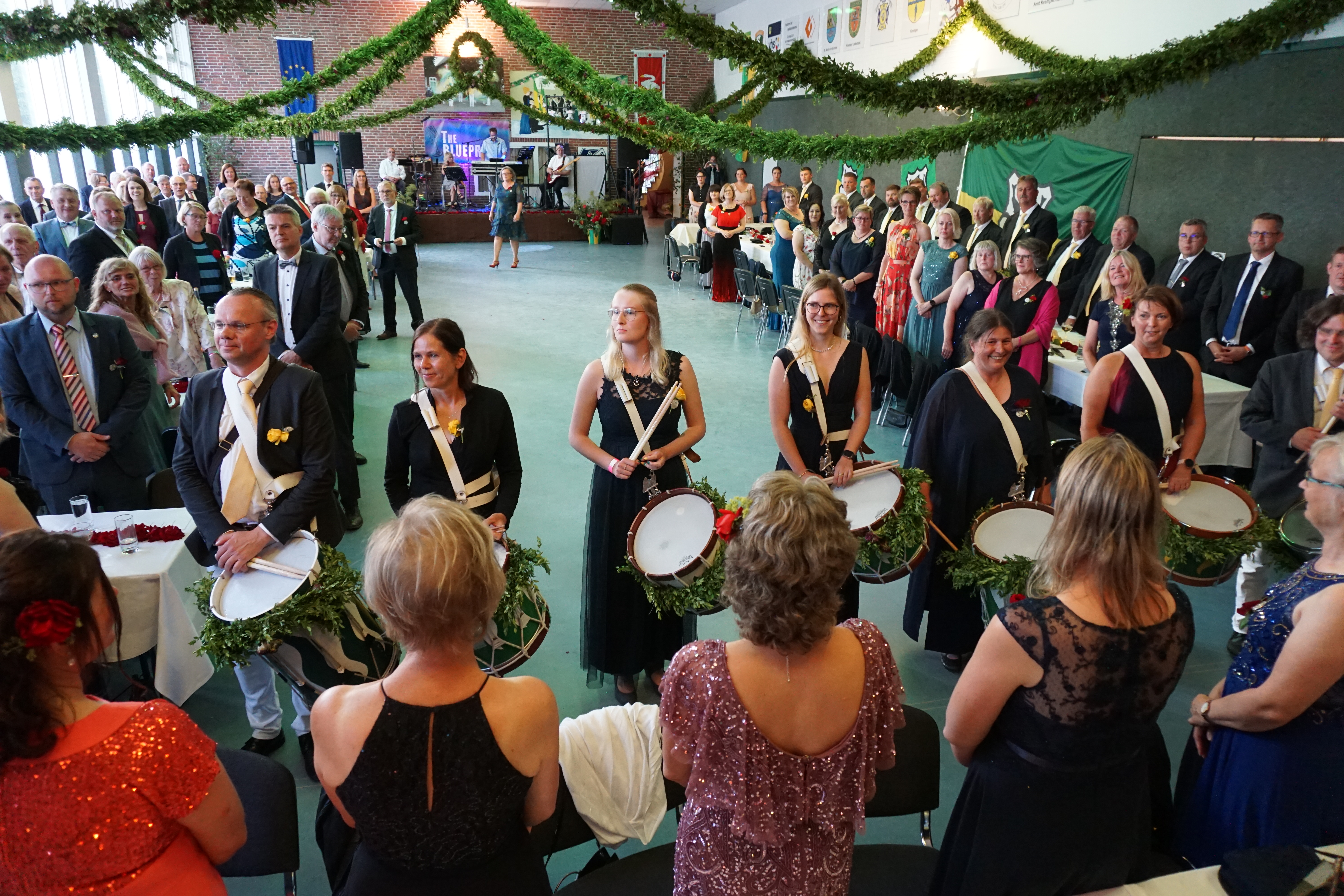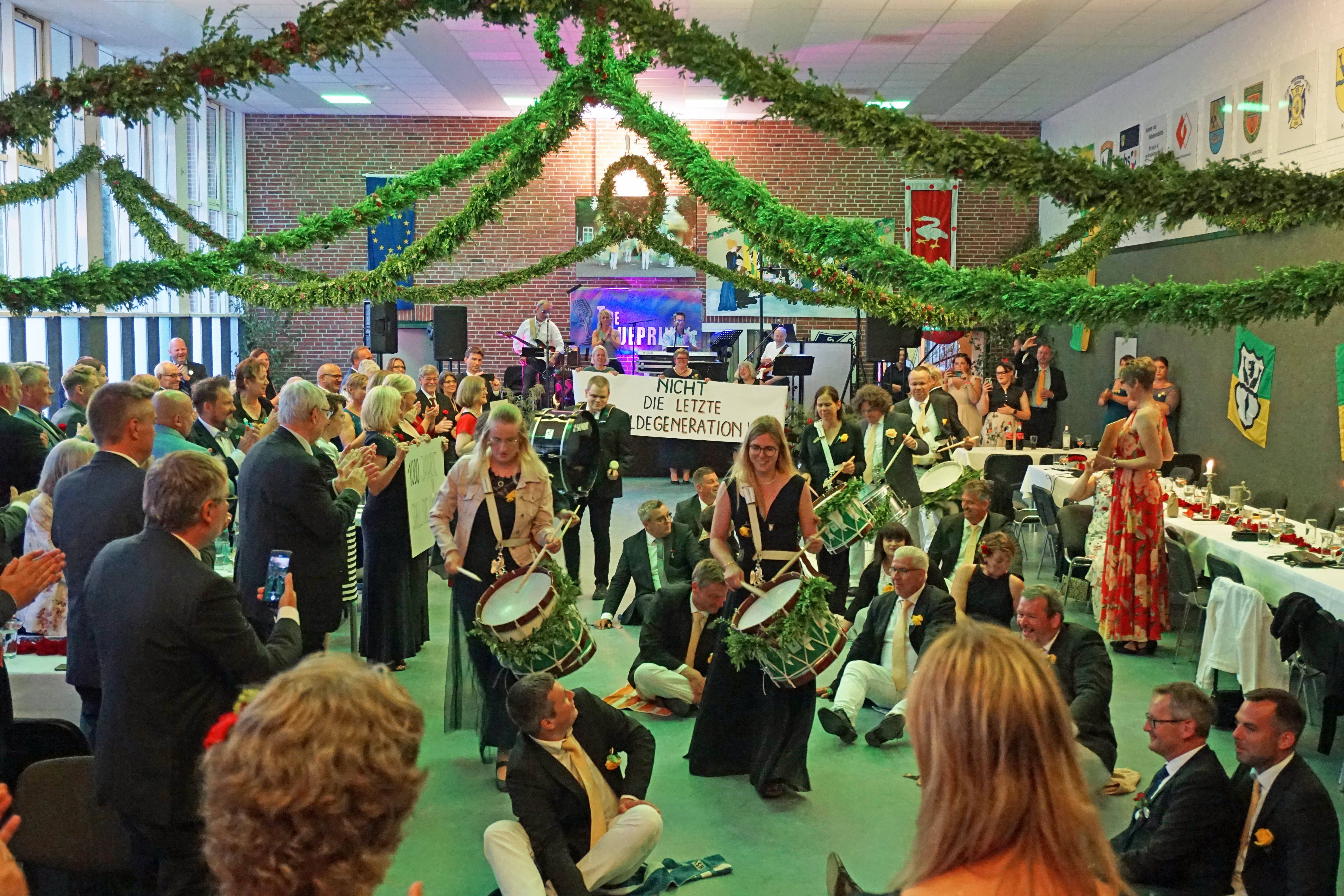 Ab 20:00 Uhr gab es die traditionellen Reden des Bürgermeister, des Ältermanns und des Hauptmanns. Danach konnte zur Musik von „The Blueprints“ wieder das Tanzbein geschwungen werden. Für einige Ehrungen und Bestrafungen wurden die Tänze kurz unterbrochen. Eine Unterbrechung gab es auch, als die Fahnenschwenker, Ordonanz, Adjutant, Zitronenlieferant und Ordonanz mit ihren Damen als „Gildekleber“ die Tanzfläche blockierten😆. Aber die Tamboure konnten die Tanzfläche schnell wieder räumen. Bis weit in die Nacht wurde der Gildeausklang noch gefeiert.