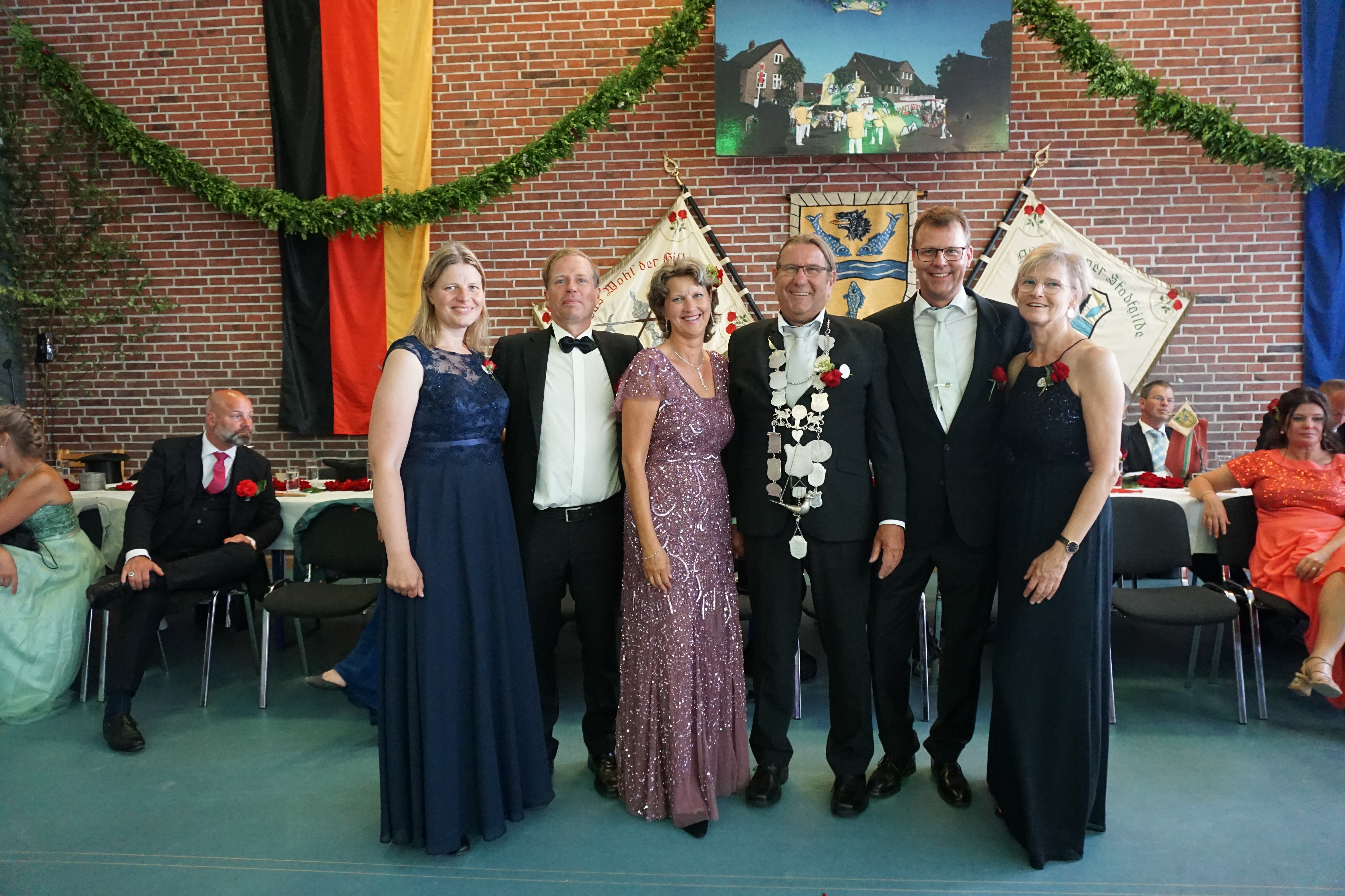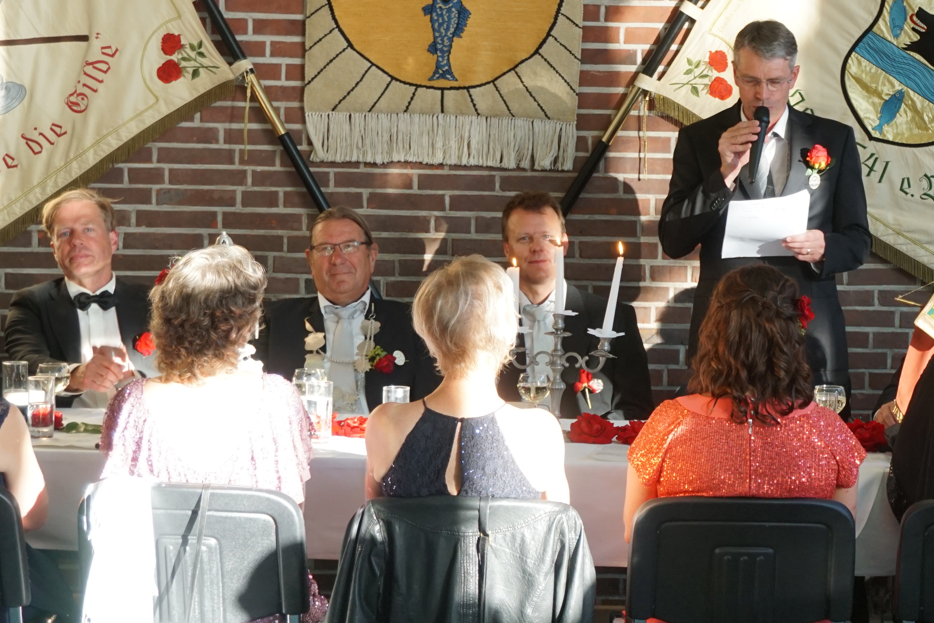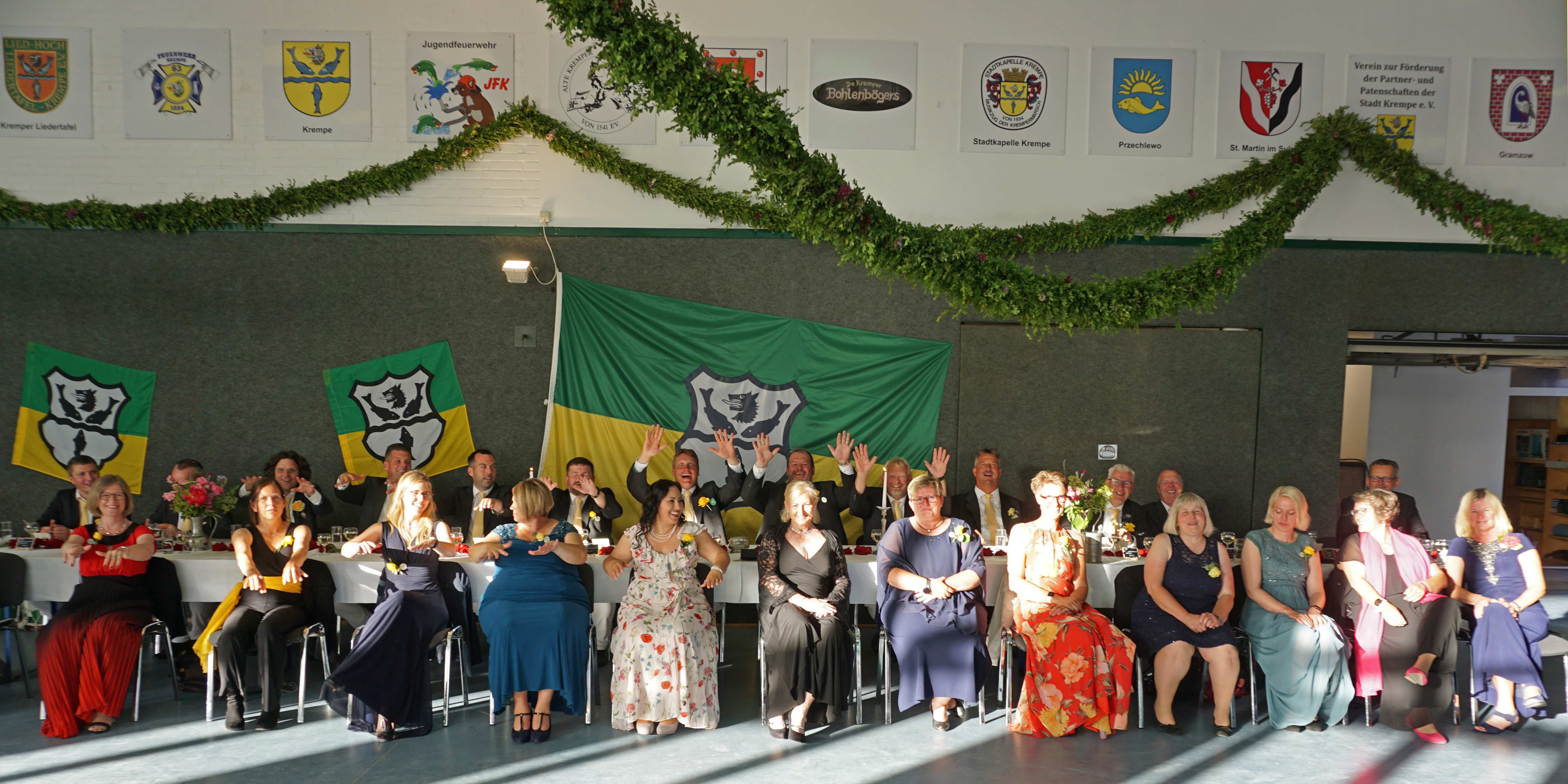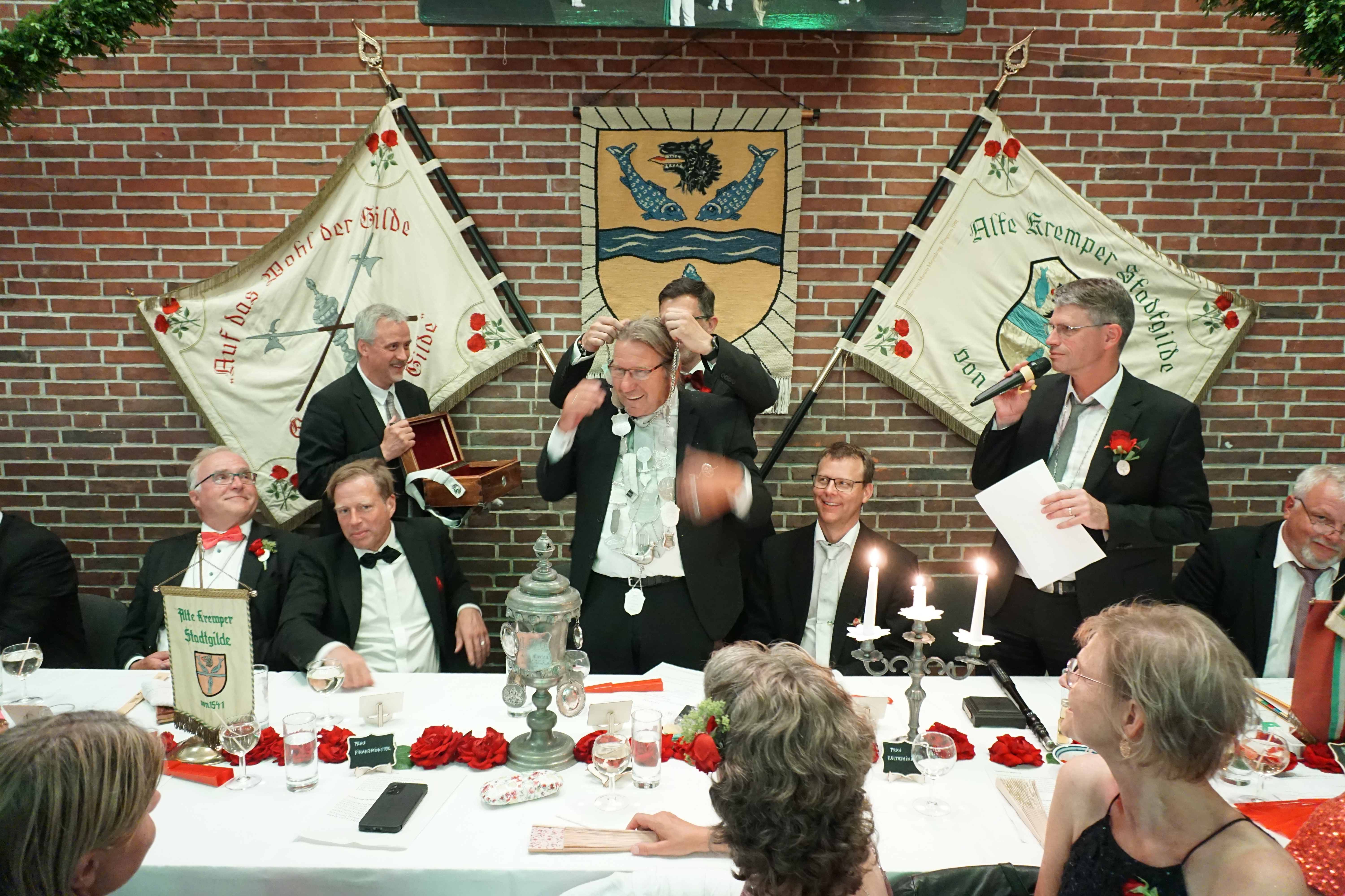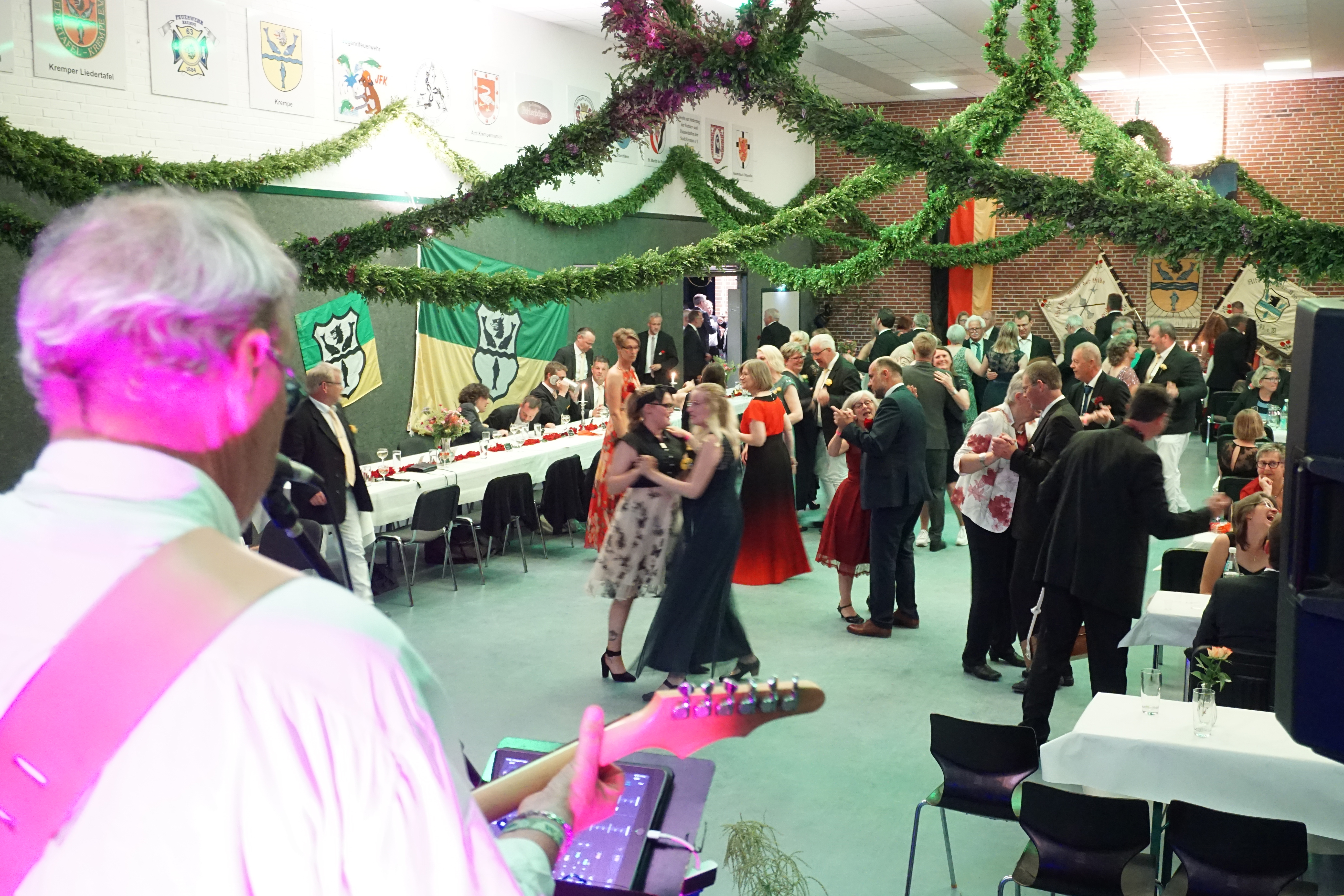 Ab 20:00 Uhr gab es die traditionellen Reden des Bürgermeister, des Ältermanns und des Hauptmanns. Danach konnte zur Musik von „The Blueprints“ wieder das Tanzbein geschwungen werden. Für einige Ehrungen und Bestrafungen wurden die Tänze kurz unterbrochen. Eine Unterbrechung gab es auch, als die Fahnenschwenker, Ordonanz, Adjutant, Zitronenlieferant und Ordonanz mit ihren Damen als „Gildekleber“ die Tanzfläche blockierten😆. Aber die Tamboure konnten die Tanzfläche schnell wieder räumen. Bis weit in die Nacht wurde der Gildeausklang noch gefeiert.