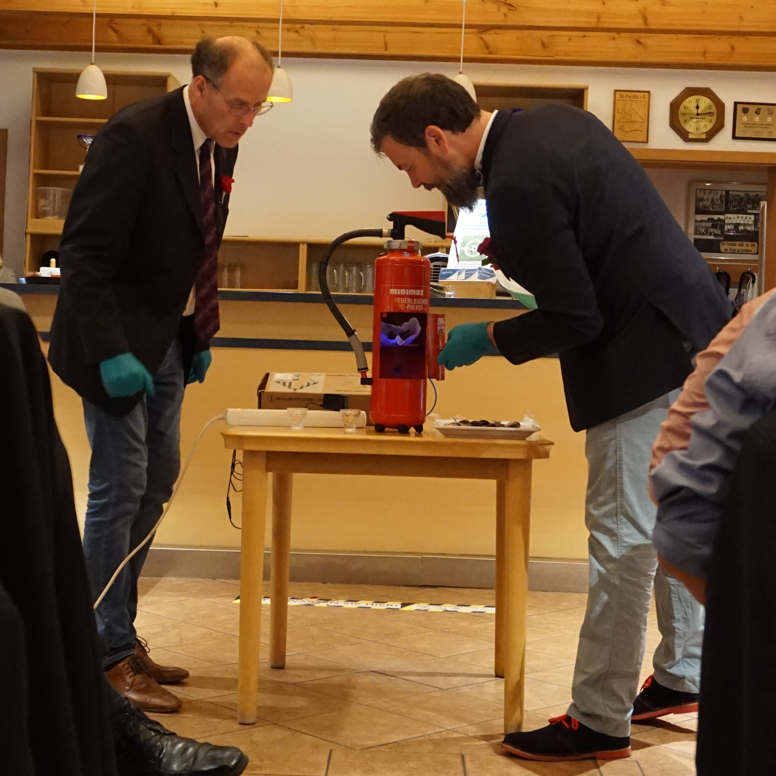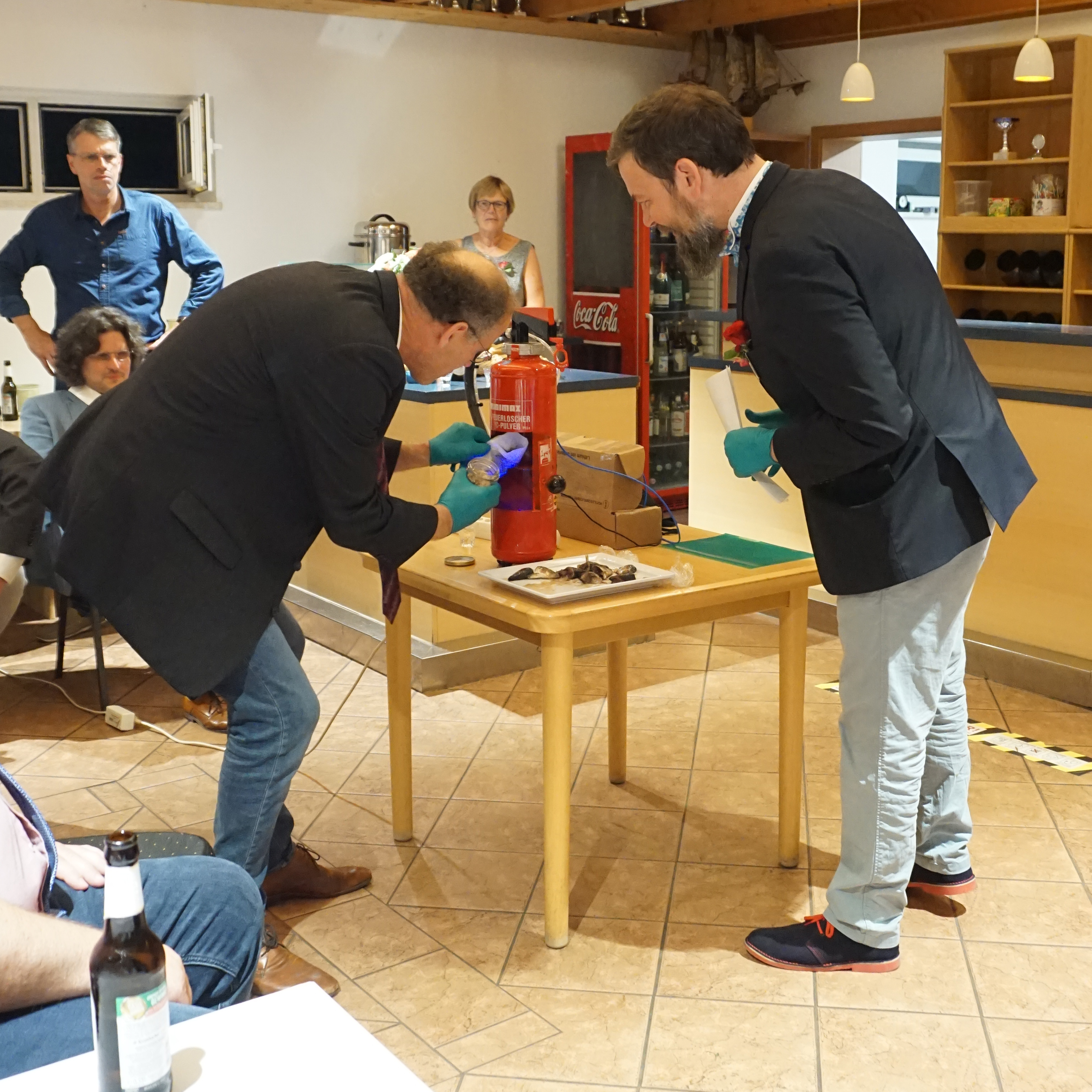 Nach der Sitzung und dem Heringssalatessen begaben sich die Teilnehmer zum TuS-Vereinsheim, wo sich die Damen der Vorstandsmitglieder ebenfalls mit dem Ablauf des 482. Gildefestes beschäftigt hatten. Dort führten die Altoffiziere Hans Lorentzen und Ron Melzig für die Jungschaffer Nico Dragesser und Tom Luka Kuske, die urlaubsbedingt abwesend waren, die „Heringskopfverwertungsmaschine“ vor.