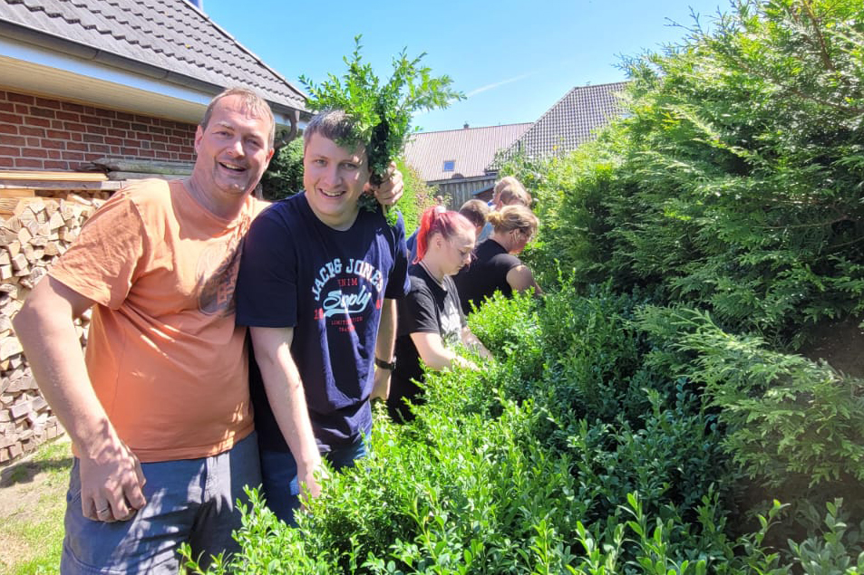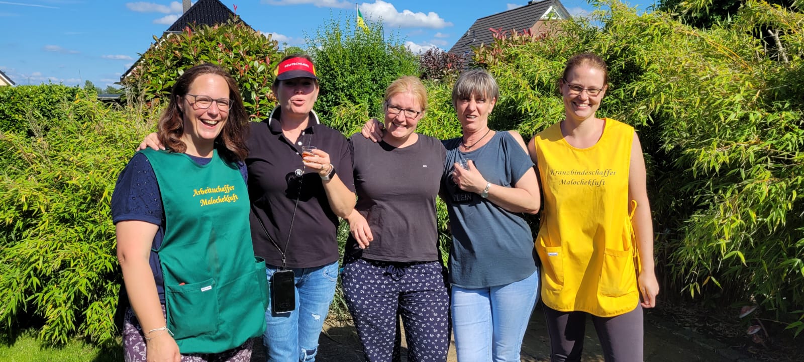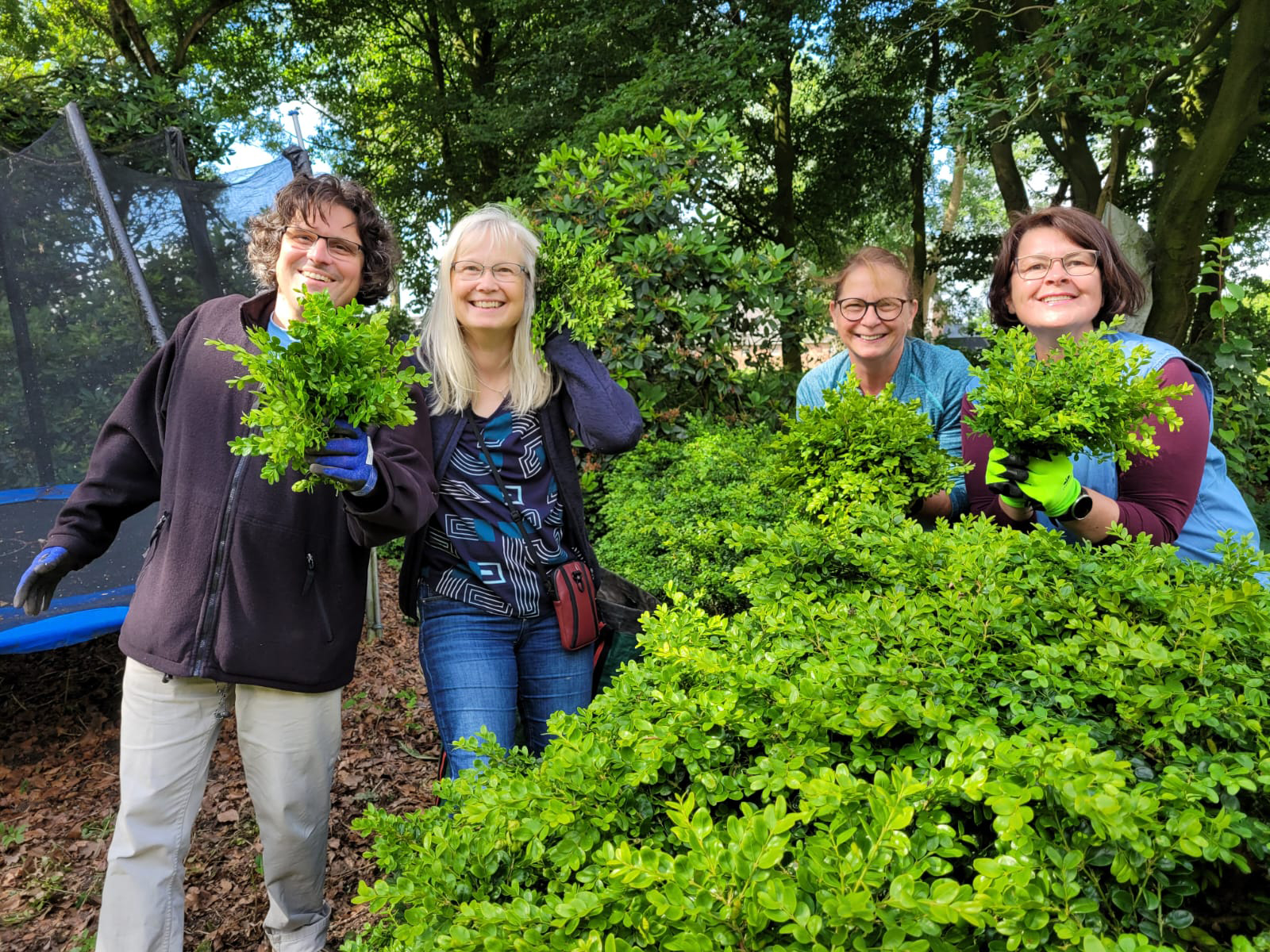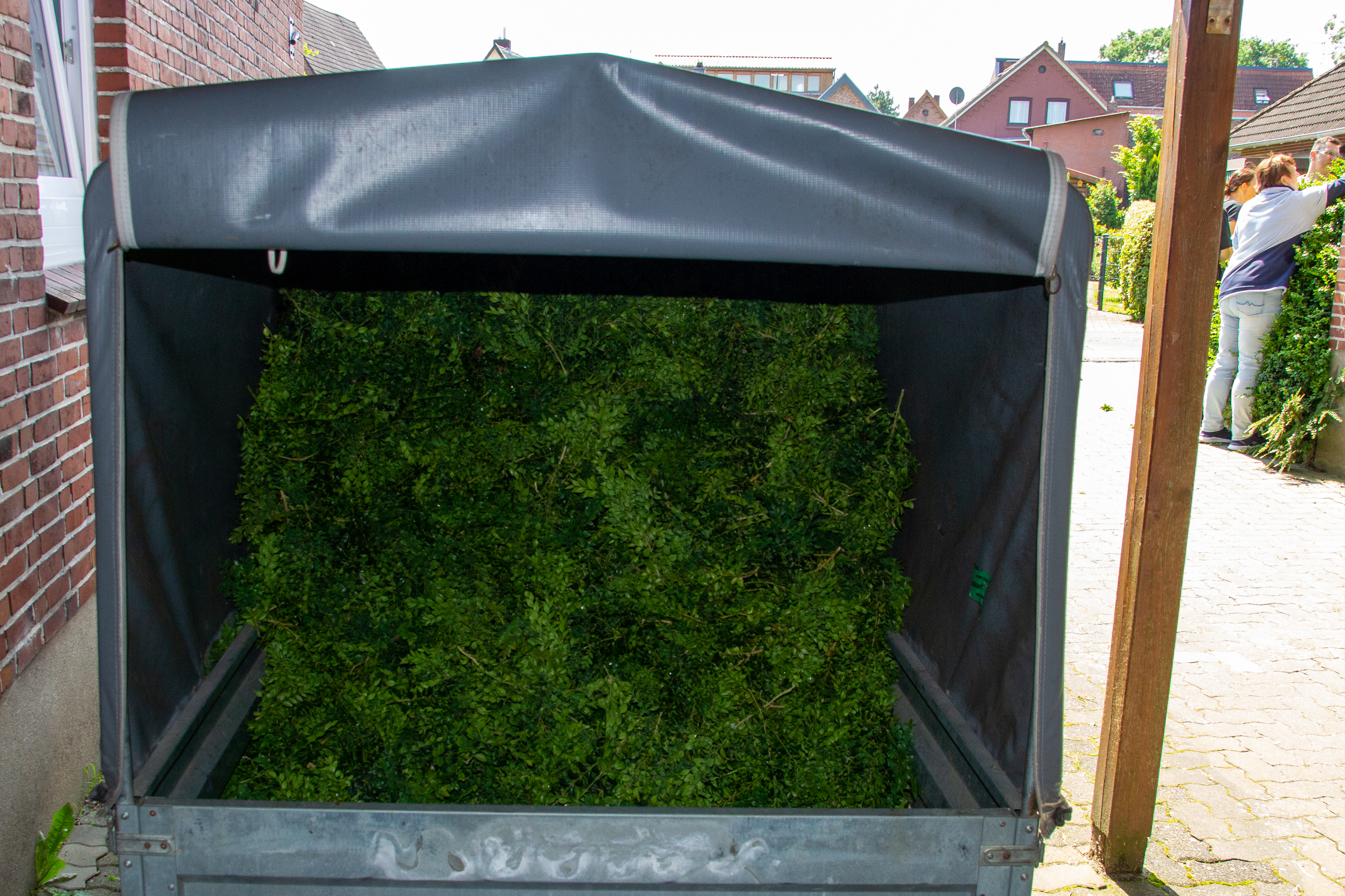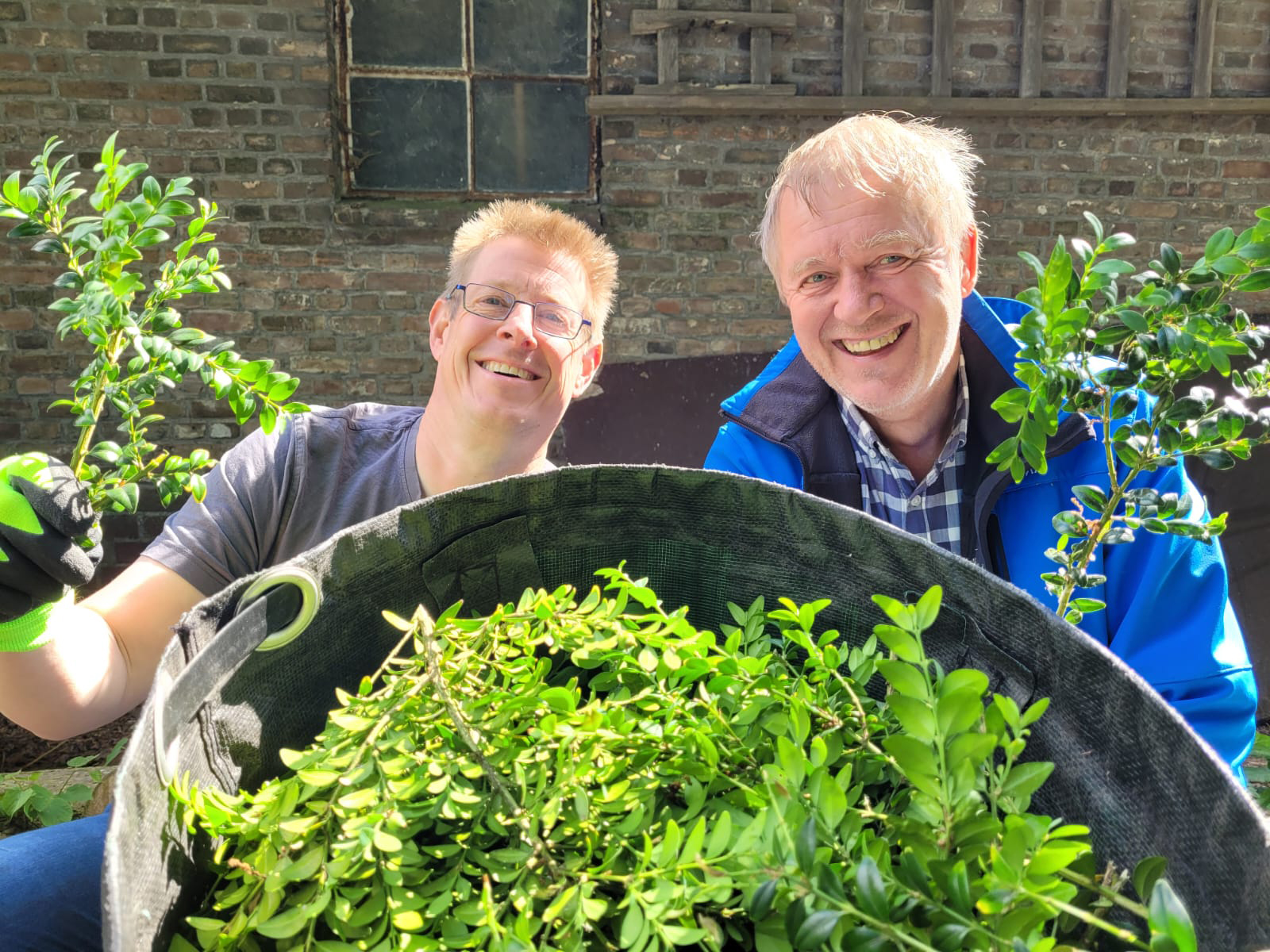 Damit am Dienstag der Gildeball in einem festlichen Ambiente stattfinden kann, binden die Damen des Gildevorstandes mit Gästen am Sonntag vorher die Kränze und die Kronen. Hierfür werden Unmengen an Buchsbaum benötigt, für deren Beschaffung die Jung- und Altschaffer zuständig sind. Also wurde in den letzten Tagen – mit Unterstützung einiger Helfer*innen – kräftig Buchsbaum gebrochen. Dass dies mehr Freude als Arbeit war, ist auf den Fotos ganz klar zu erkennen.
