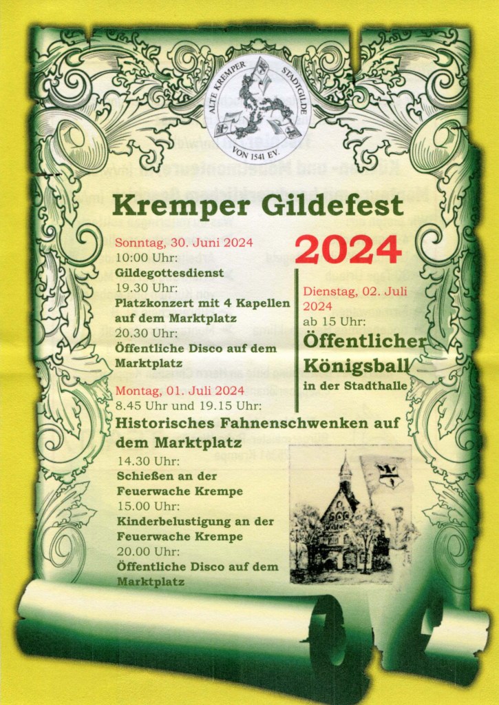 Öffentliche Gildetermine Veröffentlicht am 27. Juni 202426. Juni 2024 von TomPom Das Gildefest 2024 ist in Sichtweite. Dem Plakat können die öffentlichen Gildetermine entnommen werden. Teilen mit: Klicke, um auf X zu teilen (Wird in neuem Fenster geöffnet) X Klick, um auf Facebook zu teilen (Wird in neuem Fenster geöffnet) Facebook Gefällt mir Wird geladen …