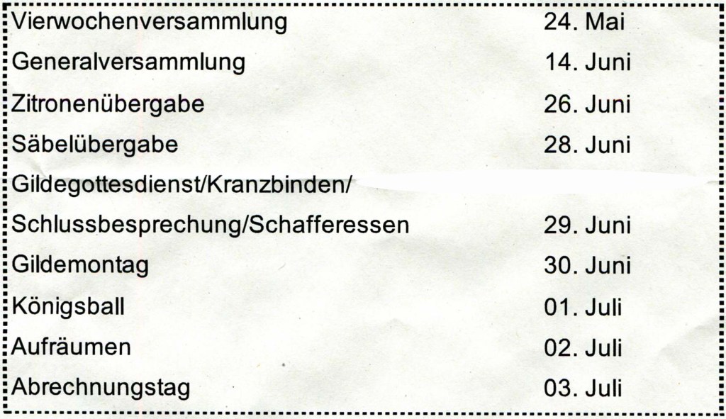 In Vorbereitung auf das Gildefest 2025 hat sich der Engere Vorstand mit der Terminplanung befasst. Das letzte Wort hierüber hat aber die Vierwochenversammlung. Davon ausgehend, dass wir auch in diesem Jahr wieder Gilde feiern wollen 😉, wird die Vierwochenversammlung auf ihrer Sitzung am 24. Mai 2025 darüber beschließen. Nicht alle der genannten Termine sind öffentlich. Folgende Termine sind angedacht: