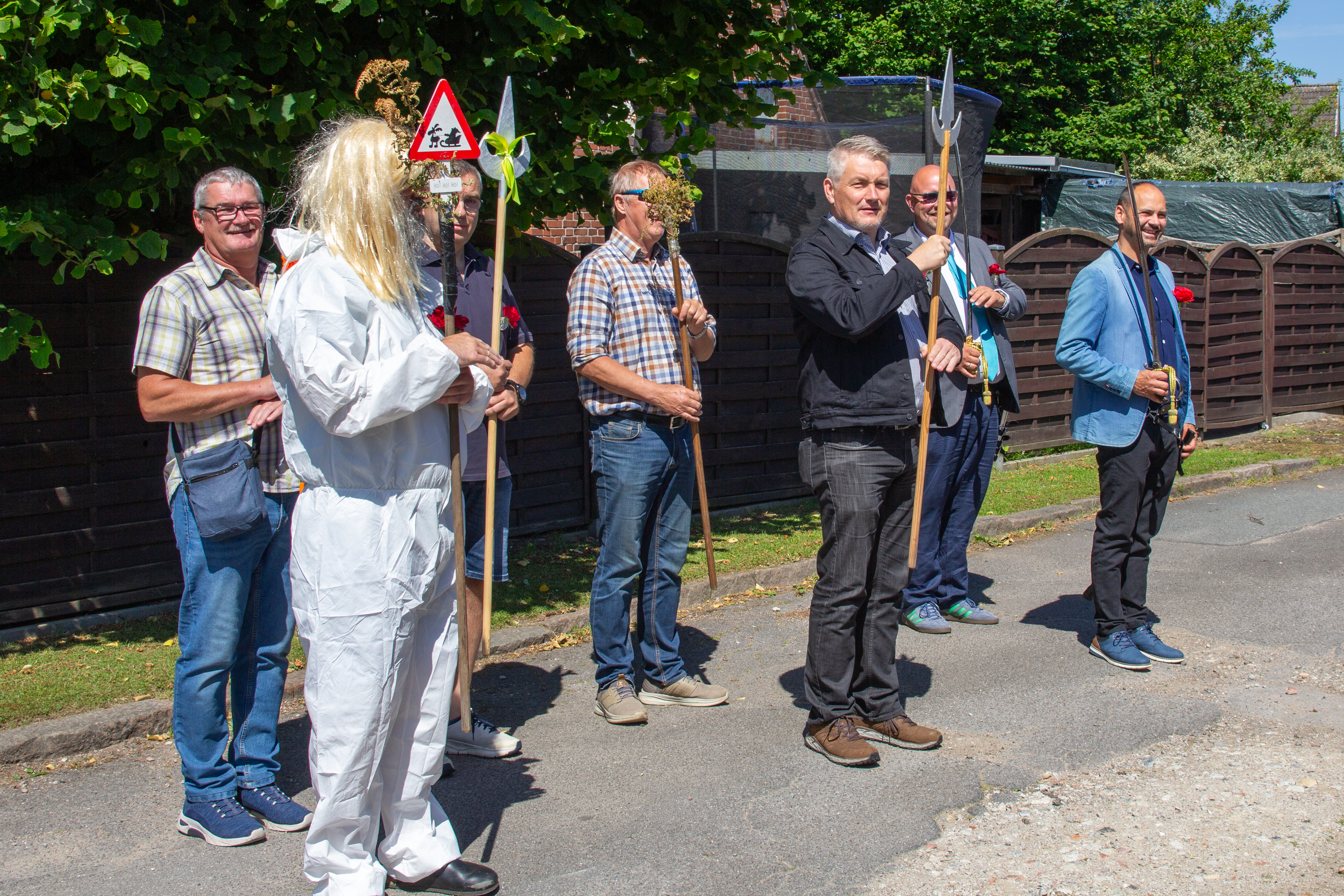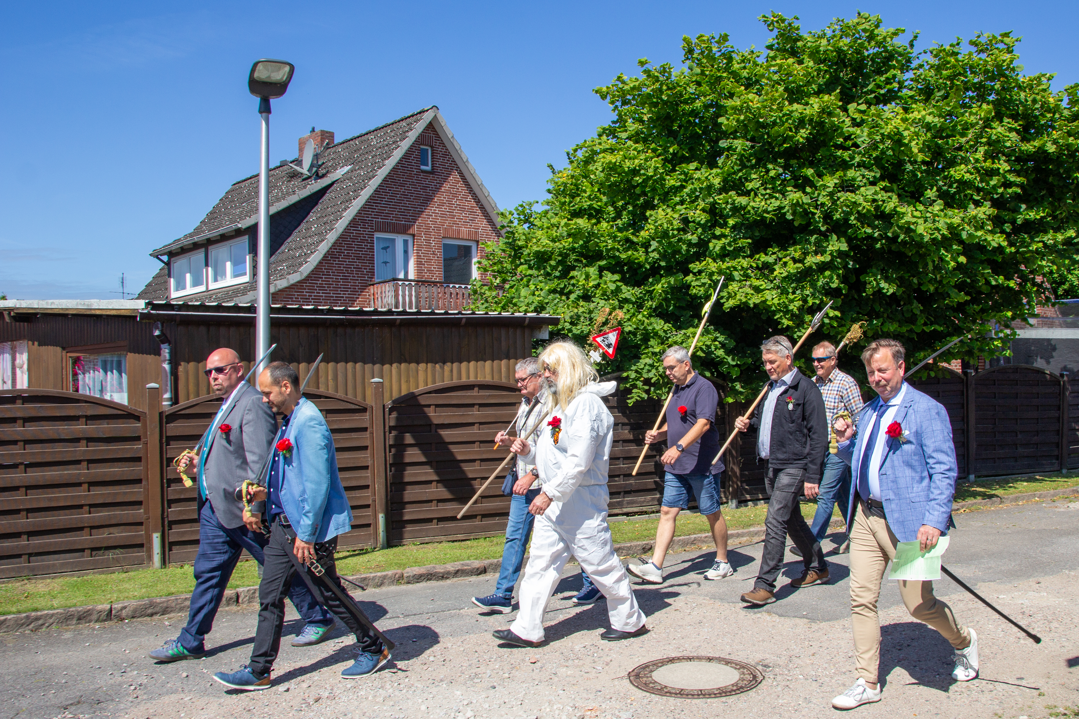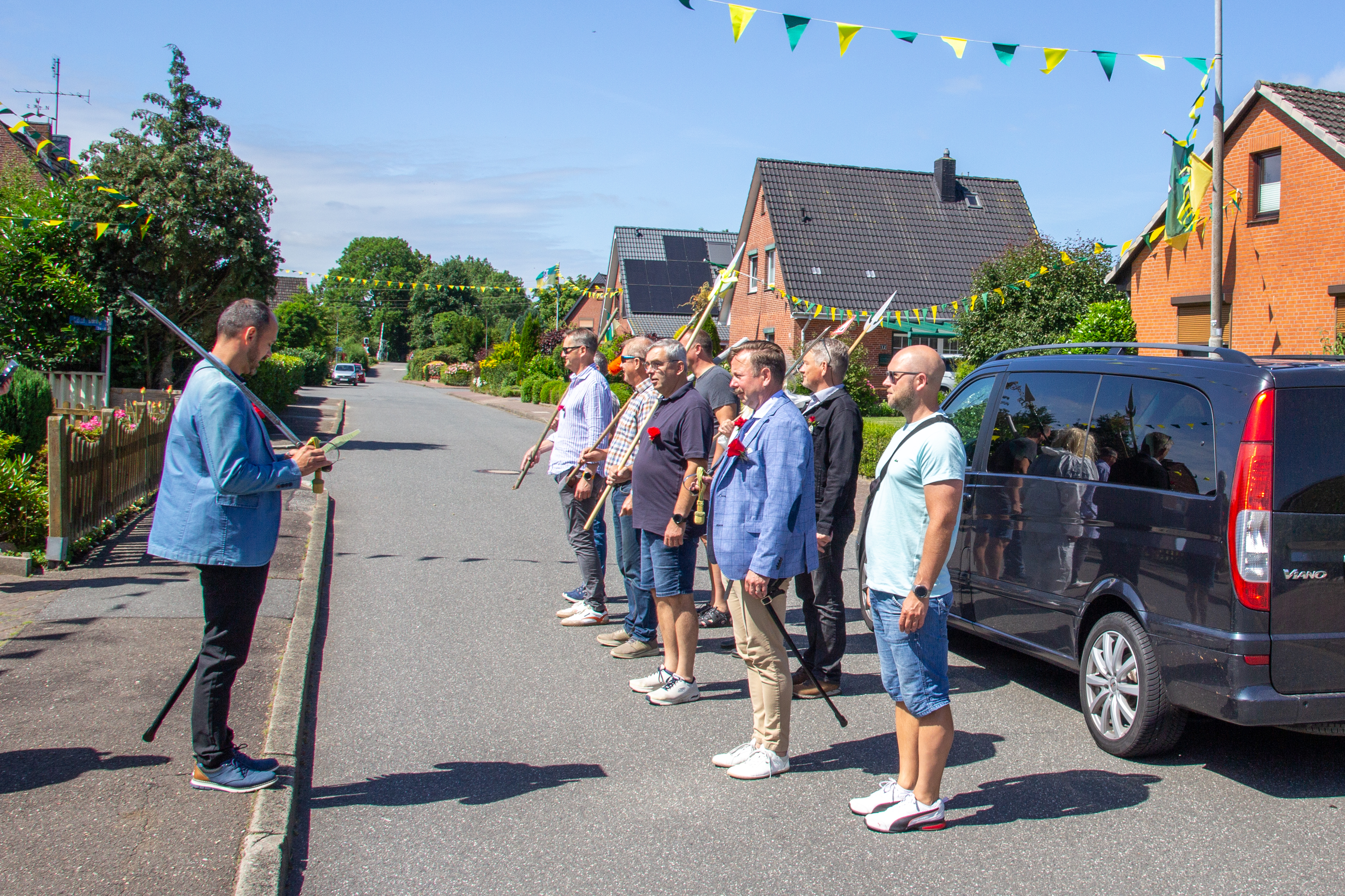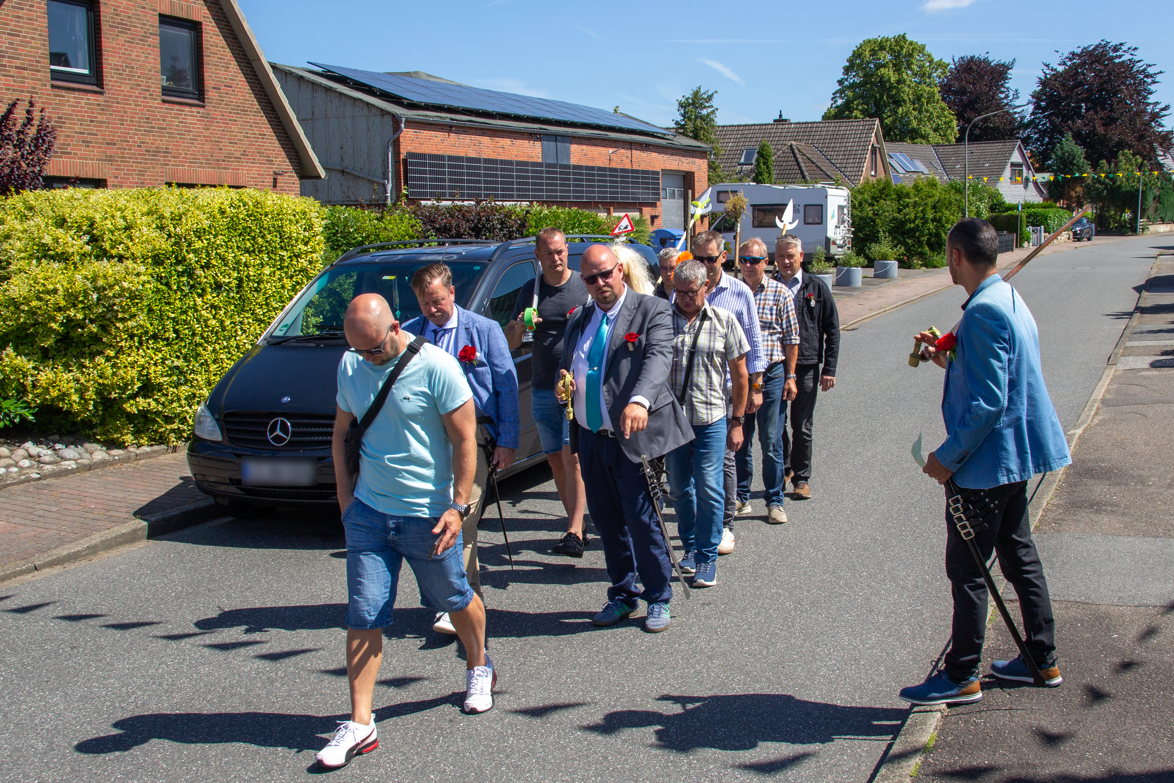 Bei einigen Märschen durch unsere kleine Stadt ist der Hauptmann nicht dabei – in solchen Fällen übernimmt einer der Altoffiziere das Kommando. Damit bei den Aufmärschen dennoch alles reibungslos verläuft, wird traditionell am Sonntag nach dem Gildegottesdienst beim Hauptmann noch einmal kräftig geübt.
