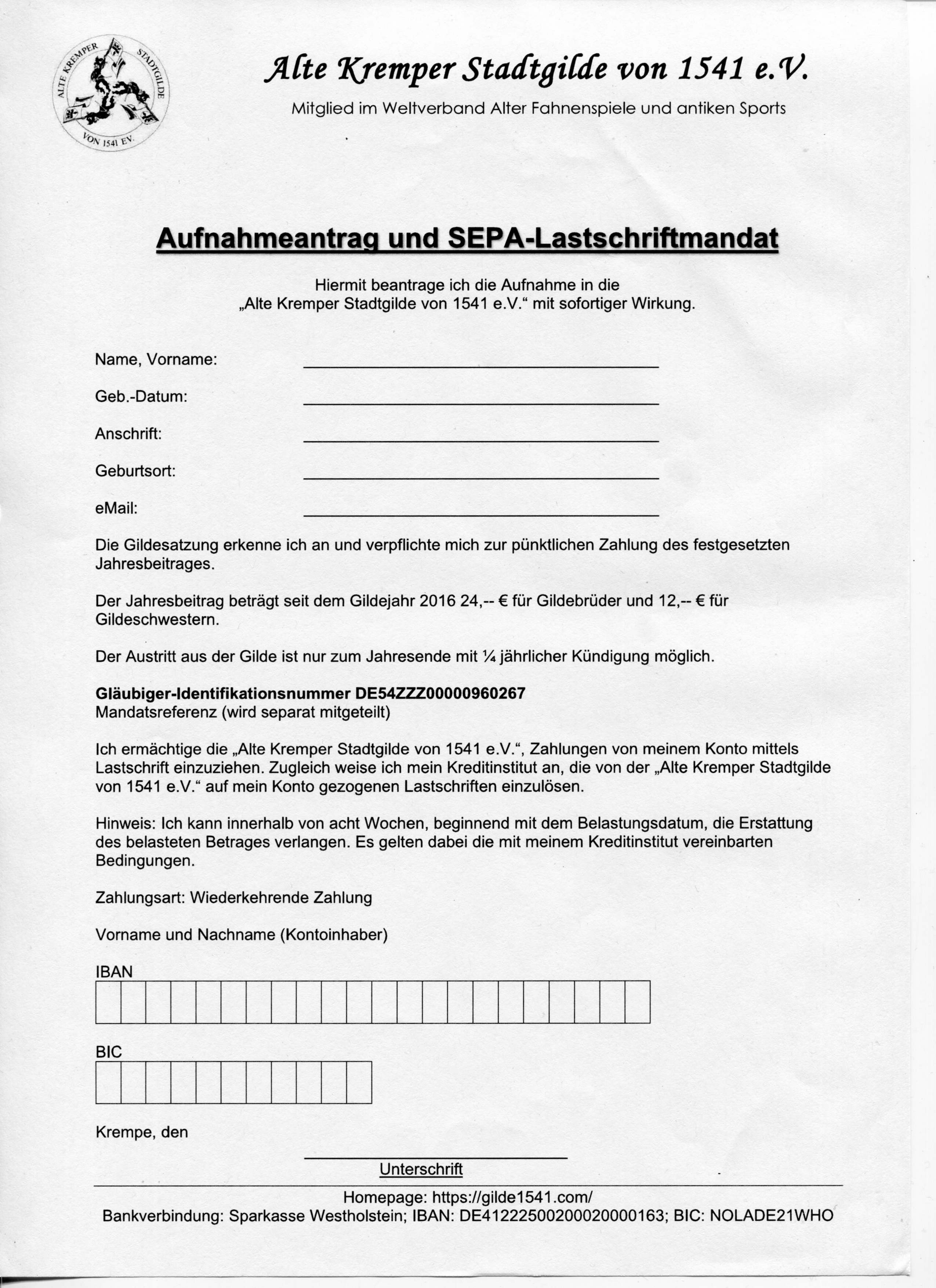 Wenn Sie Mitglied der Alten Kremper Stadtgilde von 1541 e.V. werden möchten, klicken Sie bitte auf den Aufnahmeantrag, füllen ihn aus und unterschreiben ihn. Senden Sie ihn dann bitte an die